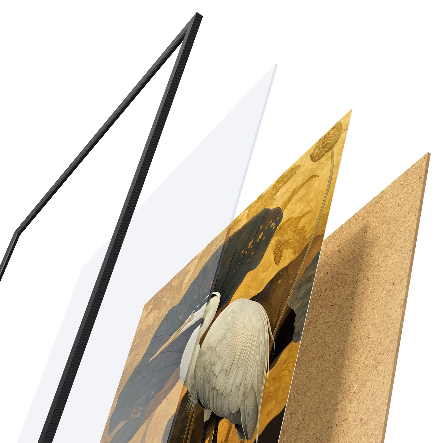 Das Poster besteht aus einem Rahmen, Plexiglas, einem gedruckten Bild und einer Rückwand aus Spanplatten. Dank der Halterungen auf der Rückseite kann das Poster sofort an die Wand gehängt werden.