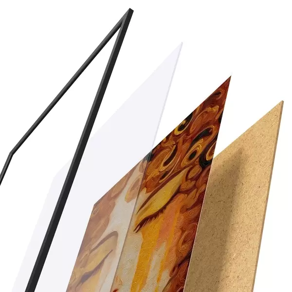 Das Poster besteht aus einem Rahmen, Plexiglas, einem gedruckten Bild und einer Rückwand aus Spanplatten. Dank der Halterungen auf der Rückseite kann das Poster sofort an die Wand gehängt werden.