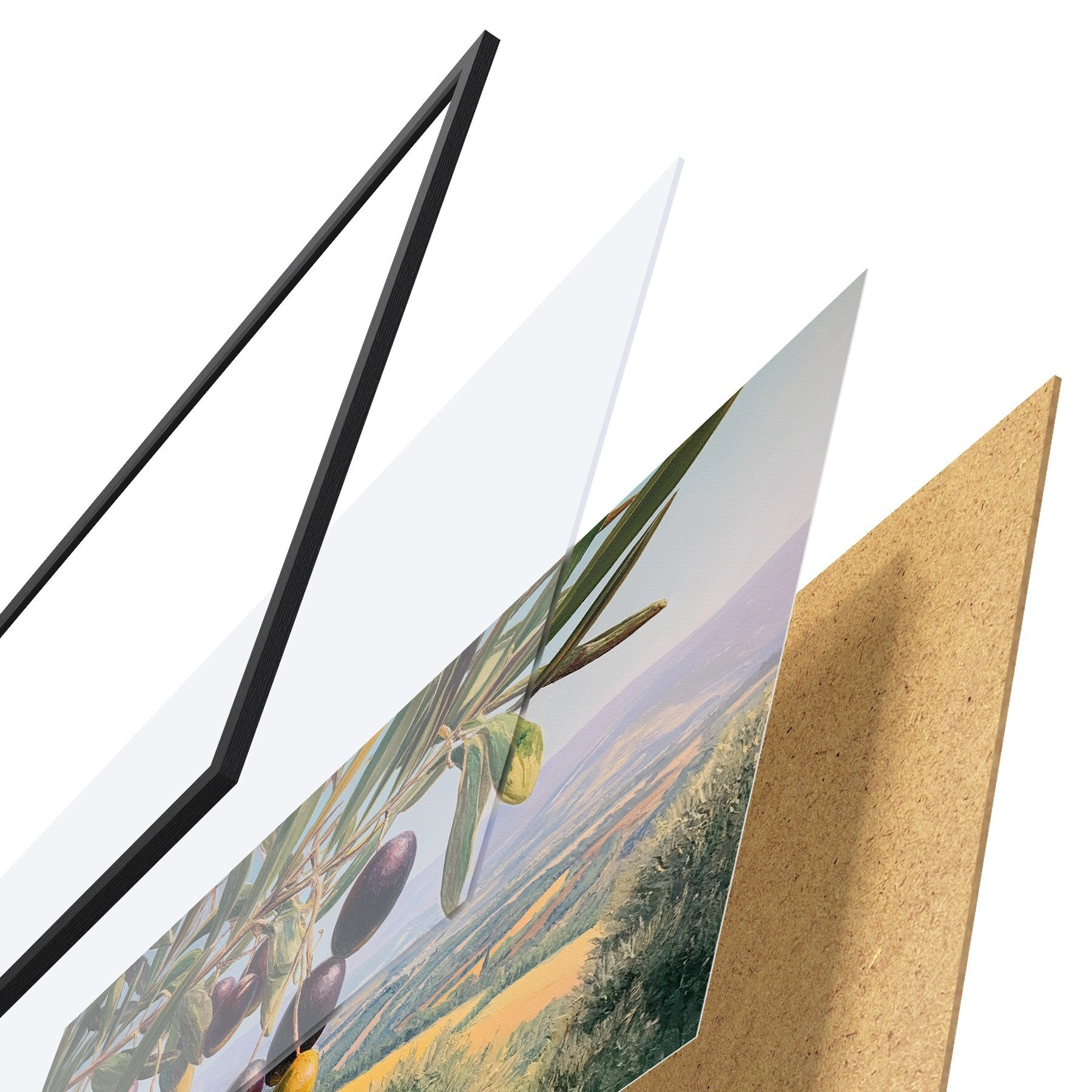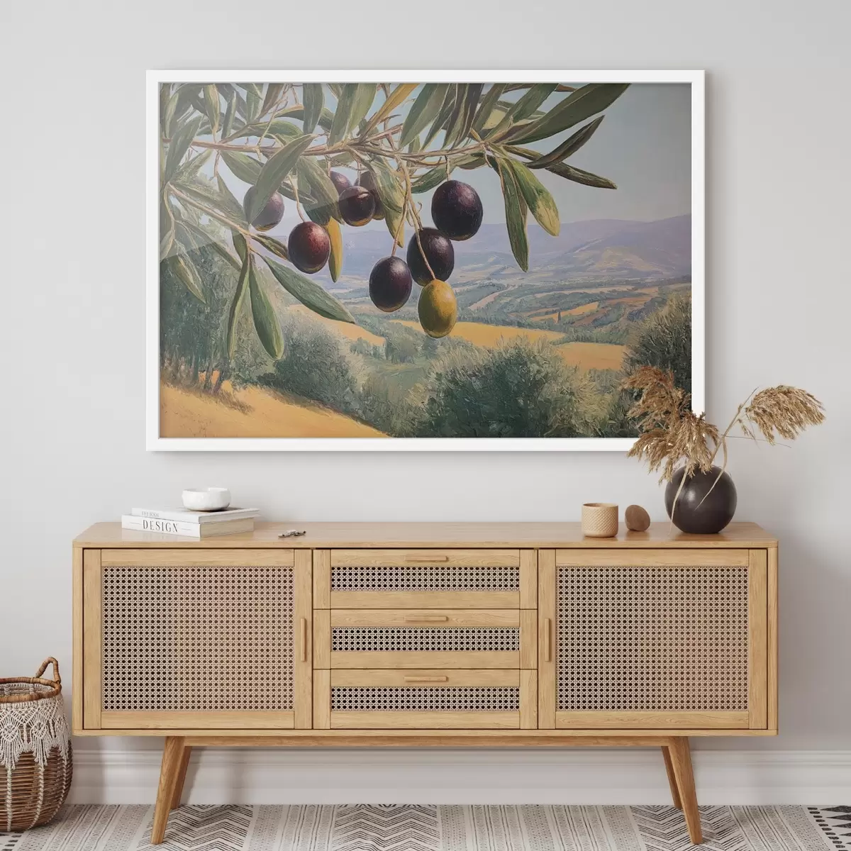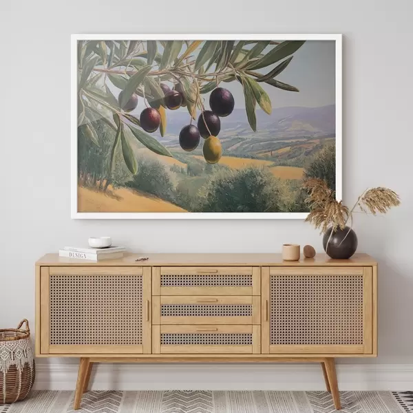 Poster Olivenzweig mit dunklen Früchten vor einer Sommerlandschaft f46150