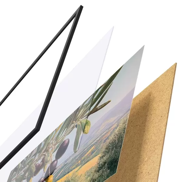 Das Poster besteht aus einem Rahmen, Plexiglas, einem gedruckten Bild und einer Rückwand aus Spanplatten. Dank der Halterungen auf der Rückseite kann das Poster sofort an die Wand gehängt werden.