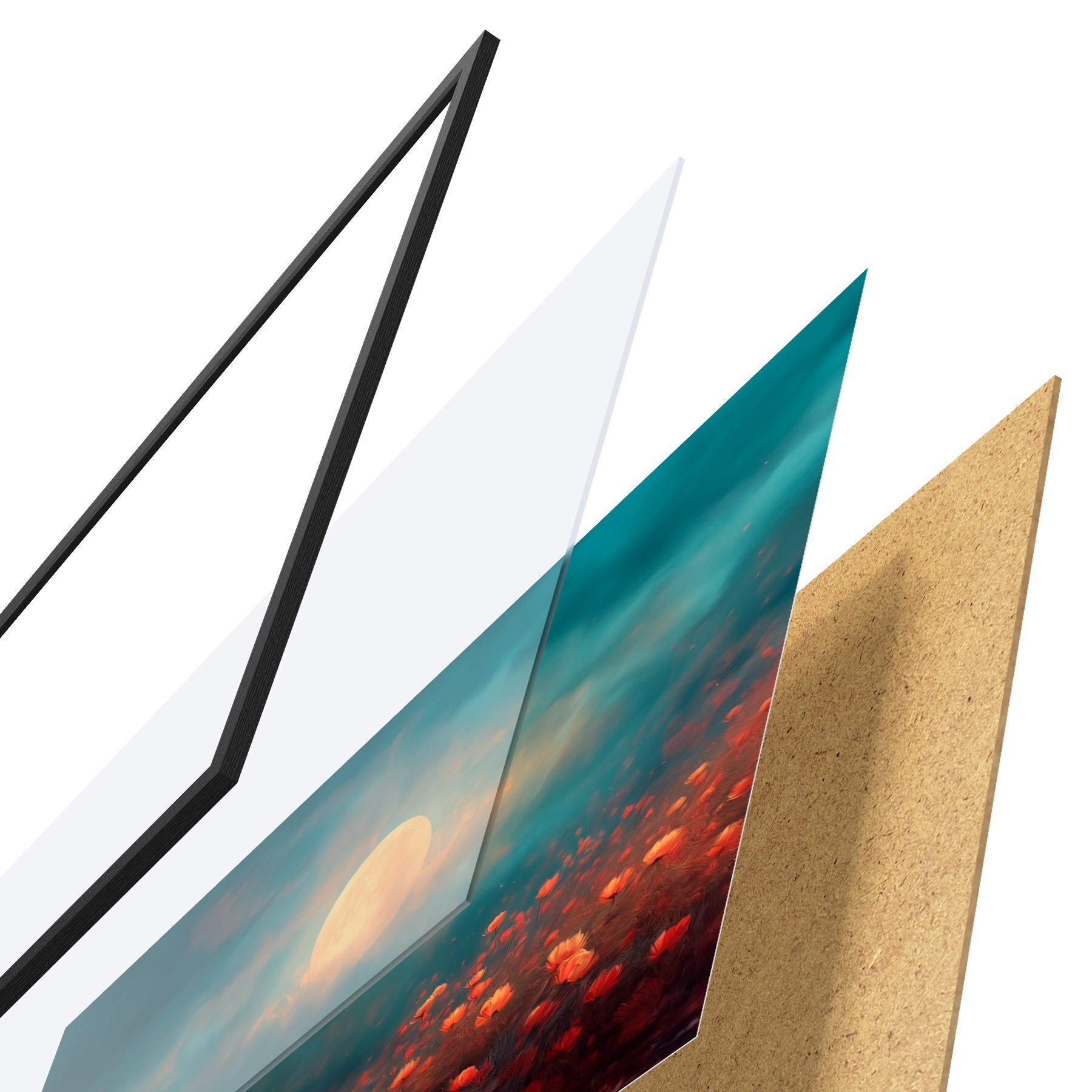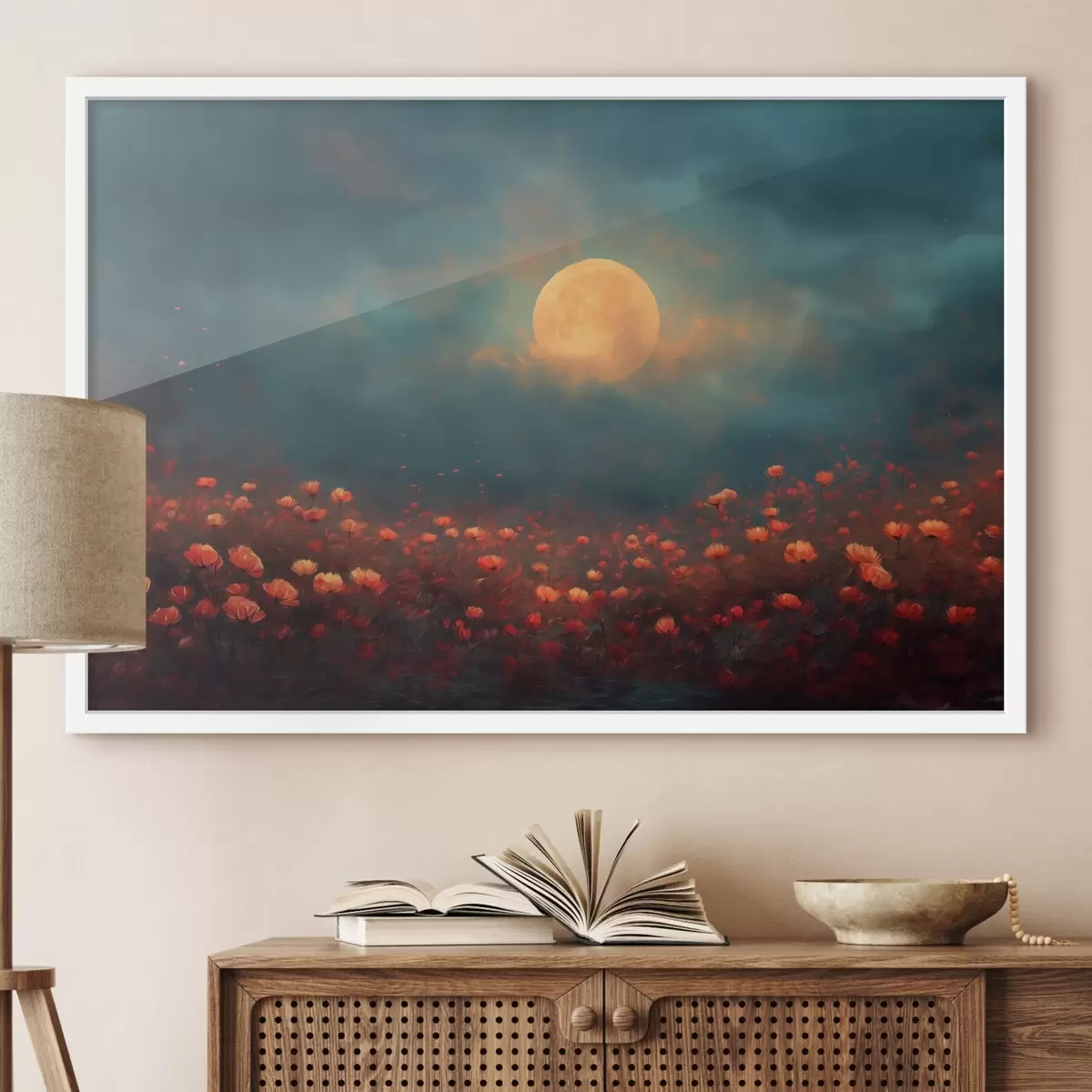 Poster Mond über einem Feld voller roter Blumen an einem nebligen Abendhimmel Nr f46167