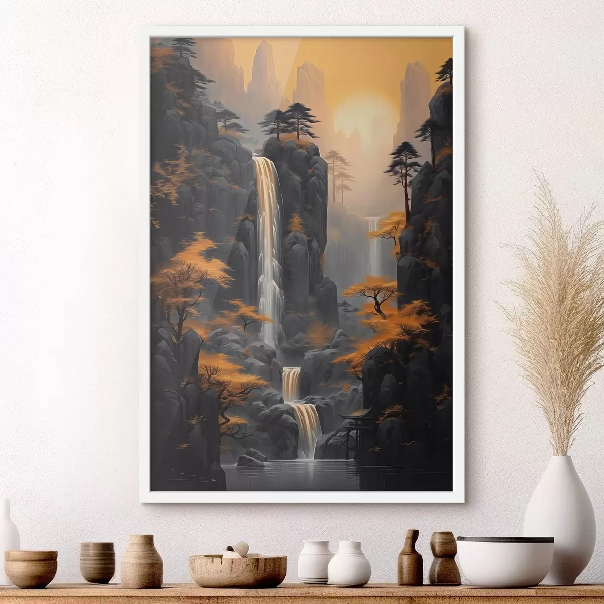 Poster Felsige Landschaft mit einem Wasserfall in warmen Sonnenuntergangsfarben Nr f46177