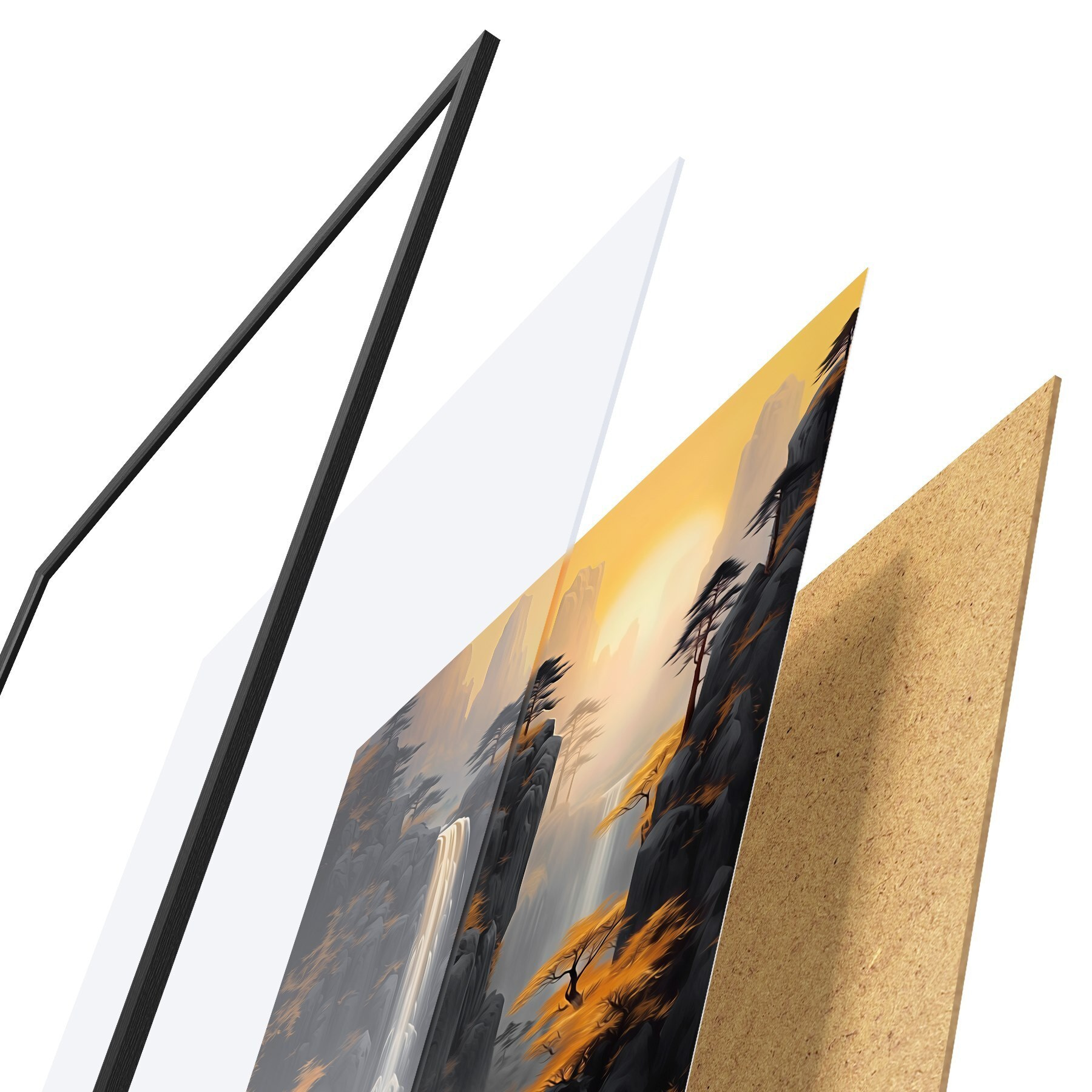 Das Poster besteht aus einem Rahmen, Plexiglas, einem gedruckten Bild und einer Rückwand aus Spanplatten. Dank der Halterungen auf der Rückseite kann das Poster sofort an die Wand gehängt werden.