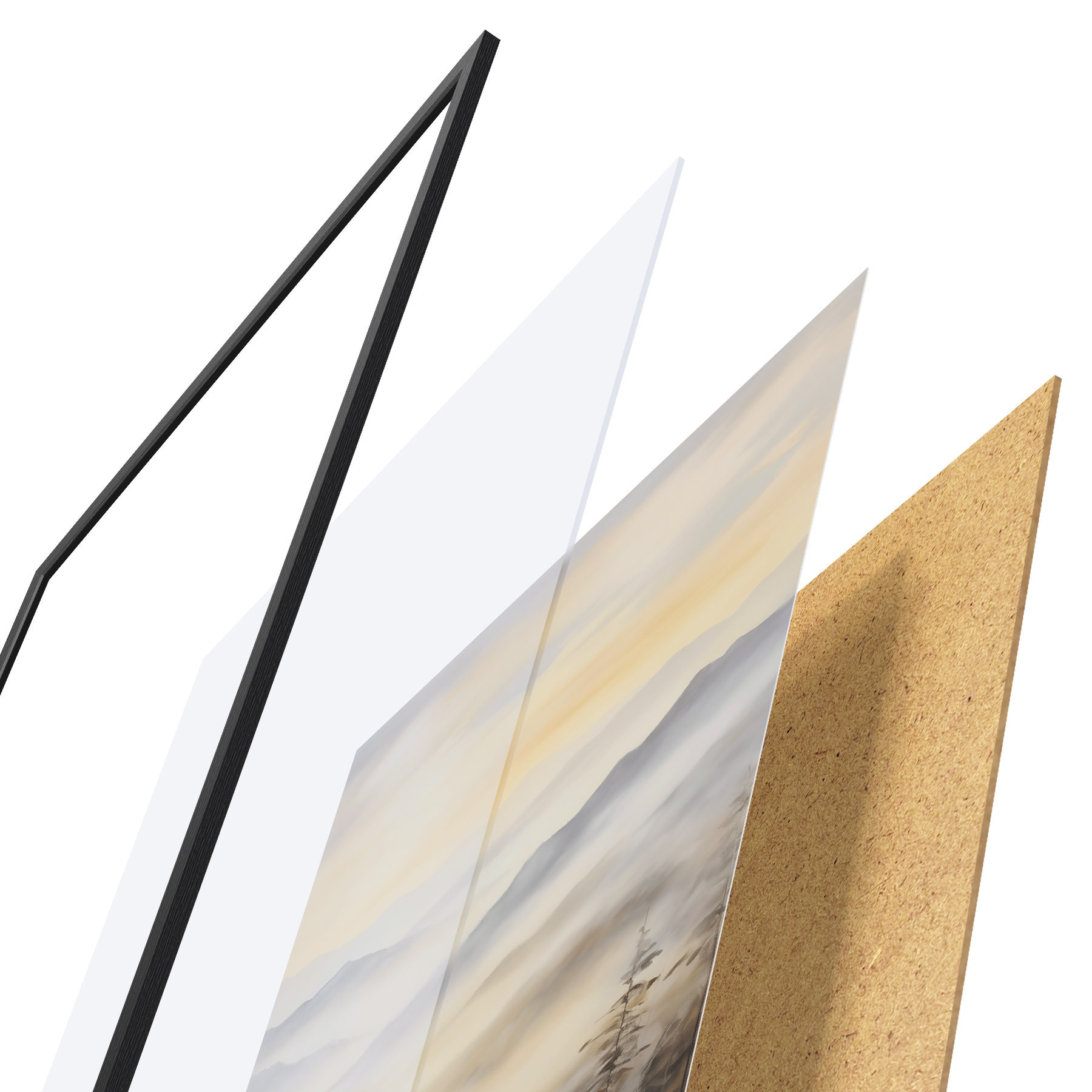 Das Poster besteht aus einem Rahmen, Plexiglas, einem gedruckten Bild und einer Rückwand aus Spanplatten. Dank der Halterungen auf der Rückseite kann das Poster sofort an die Wand gehängt werden.