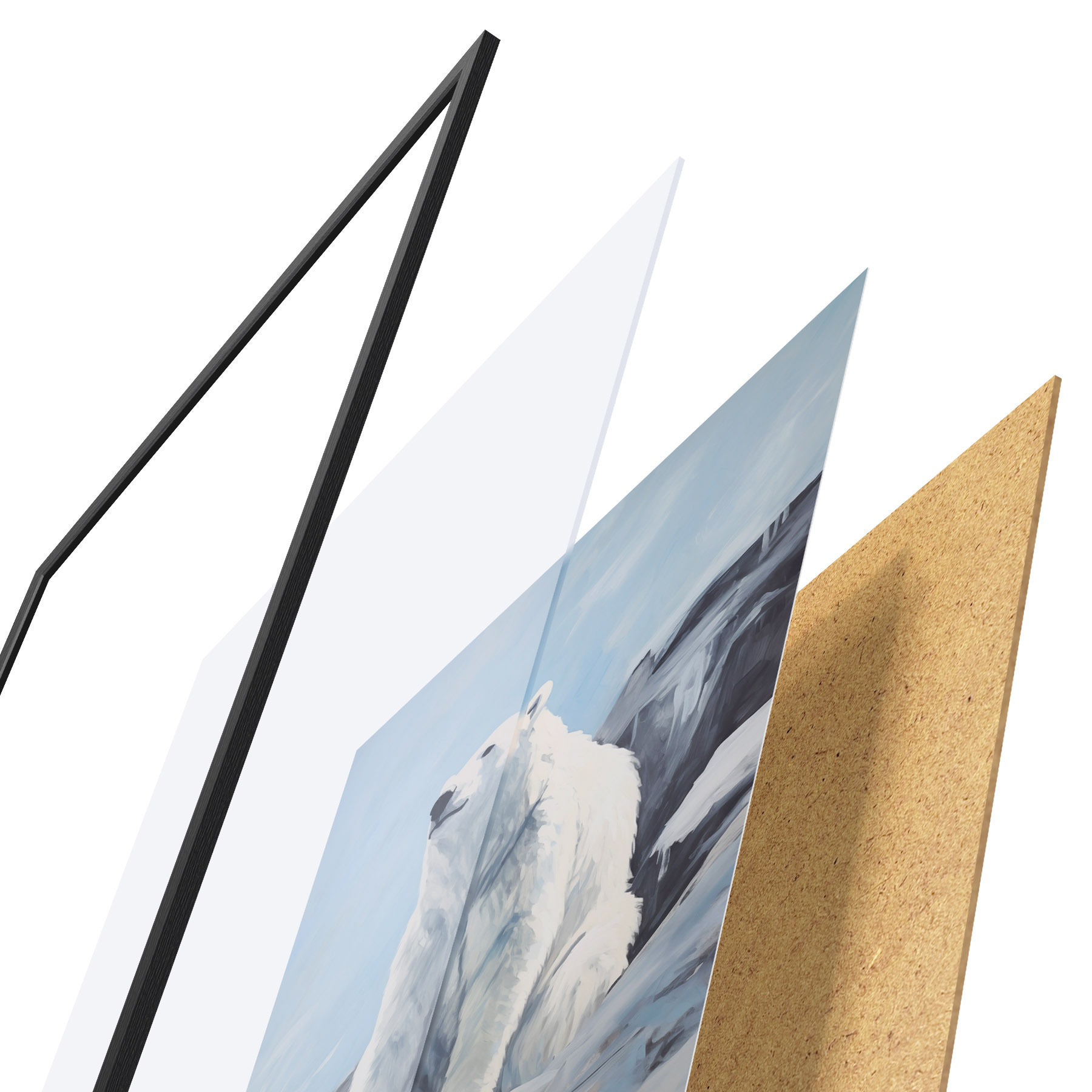 Das Poster besteht aus einem Rahmen, Plexiglas, einem gedruckten Bild und einer Rückwand aus Spanplatten. Dank der Halterungen auf der Rückseite kann das Poster sofort an die Wand gehängt werden.