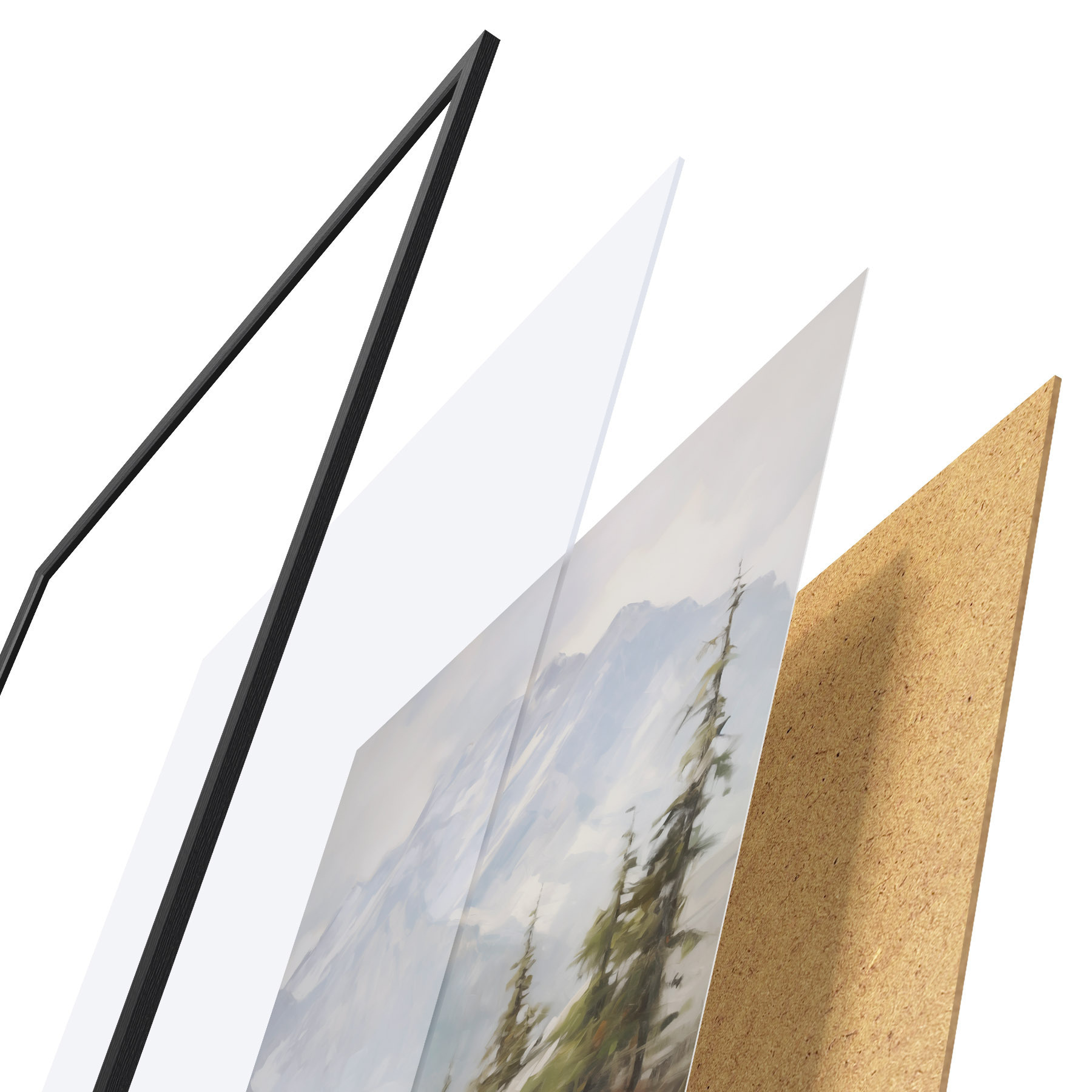 Das Poster besteht aus einem Rahmen, Plexiglas, einem gedruckten Bild und einer Rückwand aus Spanplatten. Dank der Halterungen auf der Rückseite kann das Poster sofort an die Wand gehängt werden.