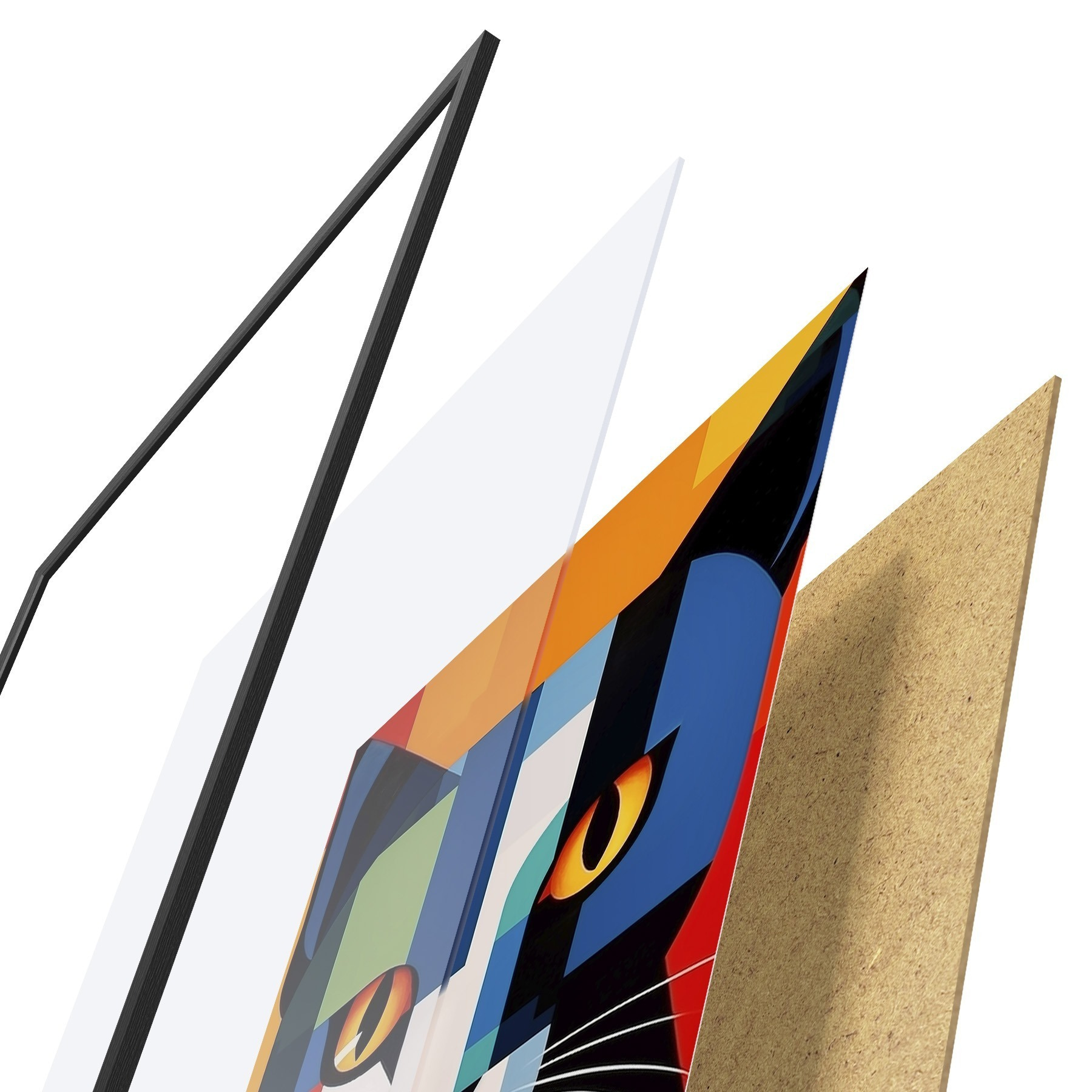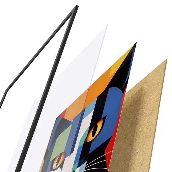 Das Poster besteht aus einem Rahmen, Plexiglas, einem gedruckten Bild und einer Rückwand aus Spanplatten. Dank der Halterungen auf der Rückseite kann das Poster sofort an die Wand gehängt werden.