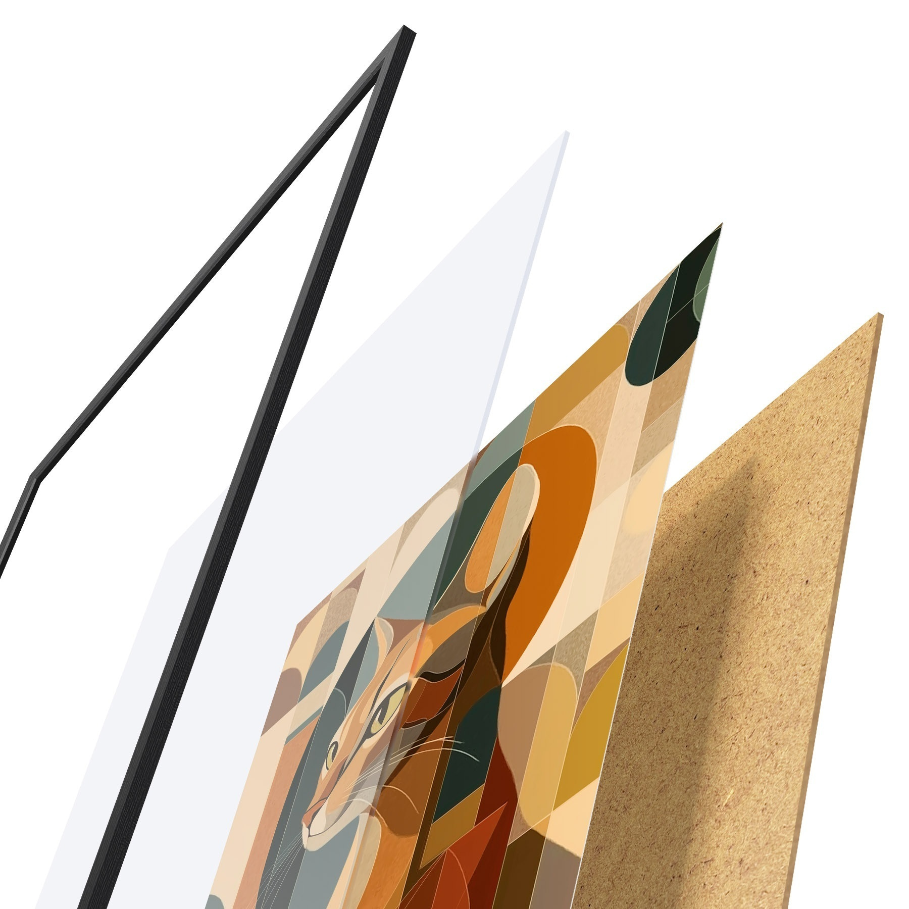 Das Poster besteht aus einem Rahmen, Plexiglas, einem gedruckten Bild und einer Rückwand aus Spanplatten. Dank der Halterungen auf der Rückseite kann das Poster sofort an die Wand gehängt werden.