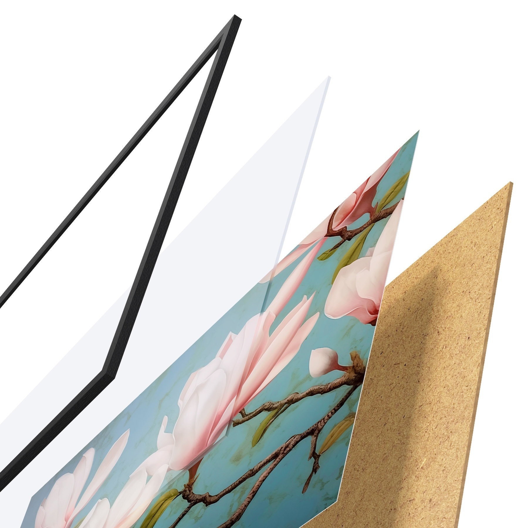 Das Poster besteht aus einem Rahmen, Plexiglas, einem gedruckten Bild und einer Rückwand aus Spanplatten. Dank der Halterungen auf der Rückseite kann das Poster sofort an die Wand gehängt werden.