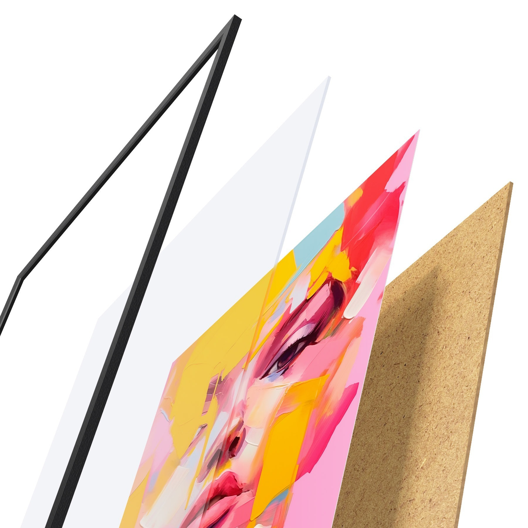 Das Poster besteht aus einem Rahmen, Plexiglas, einem gedruckten Bild und einer Rückwand aus Spanplatten. Dank der Halterungen auf der Rückseite kann das Poster sofort an die Wand gehängt werden.