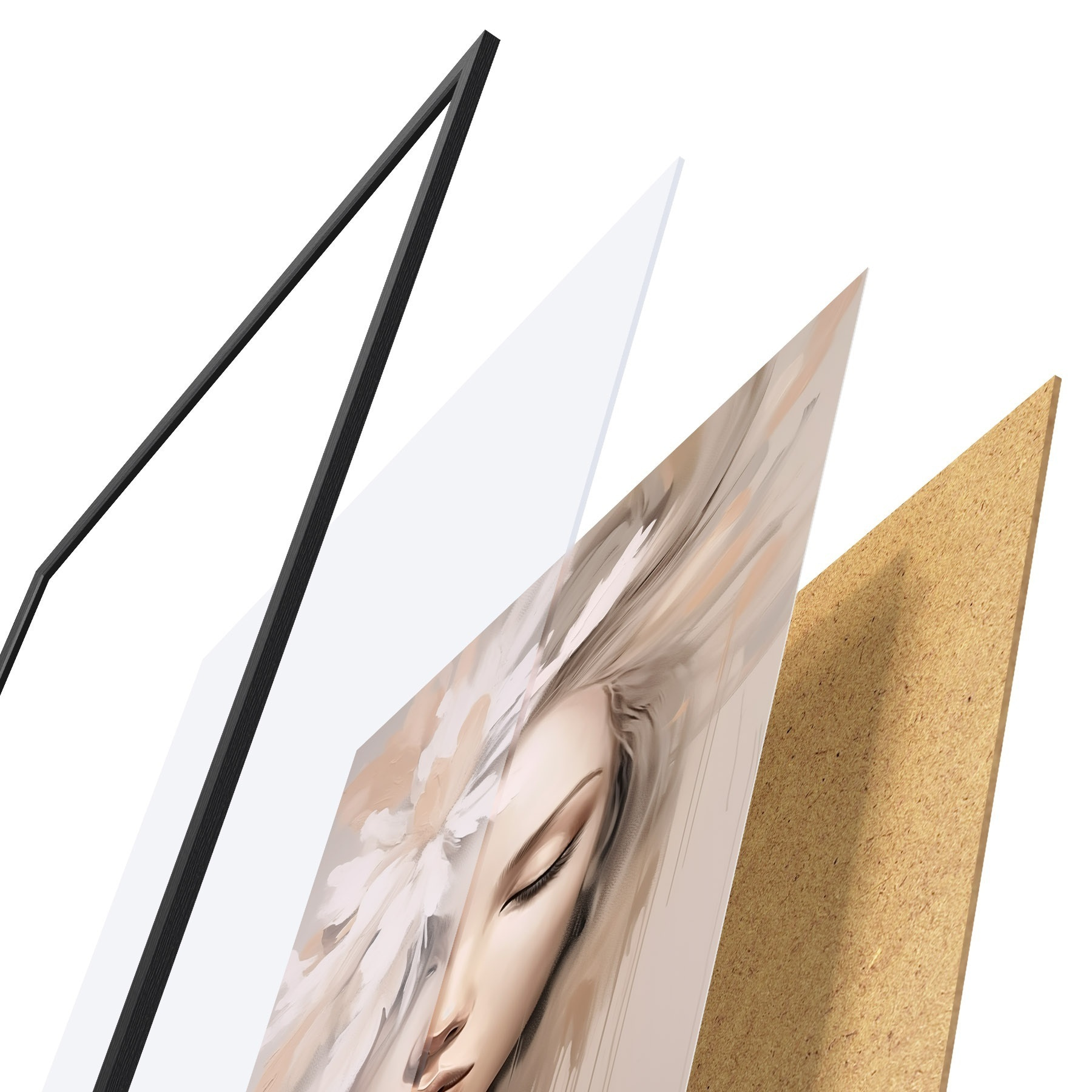 Das Poster besteht aus einem Rahmen, Plexiglas, einem gedruckten Bild und einer Rückwand aus Spanplatten. Dank der Halterungen auf der Rückseite kann das Poster sofort an die Wand gehängt werden.