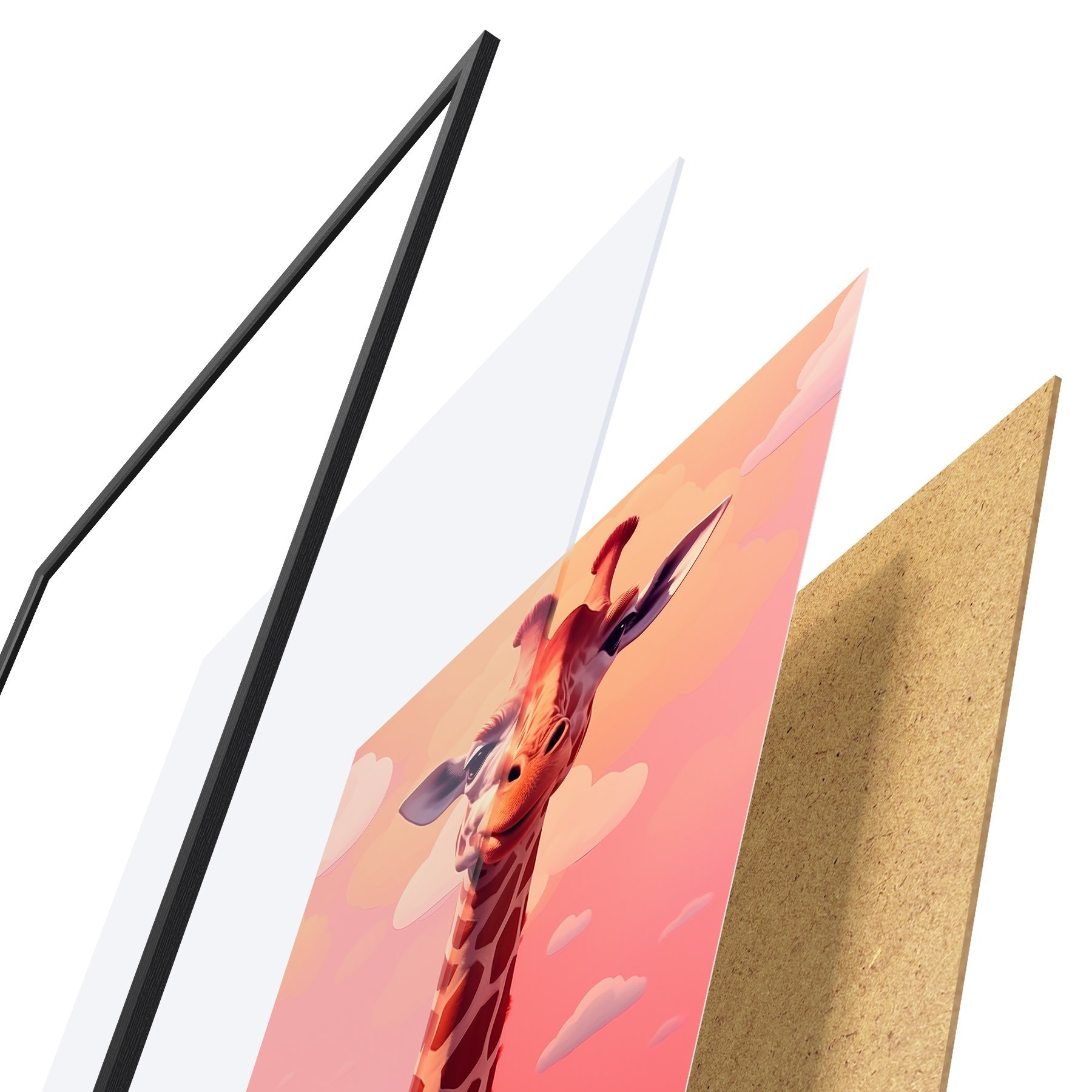Das Poster besteht aus einem Rahmen, Plexiglas, einem gedruckten Bild und einer Rückwand aus Spanplatten. Dank der Halterungen auf der Rückseite kann das Poster sofort an die Wand gehängt werden.