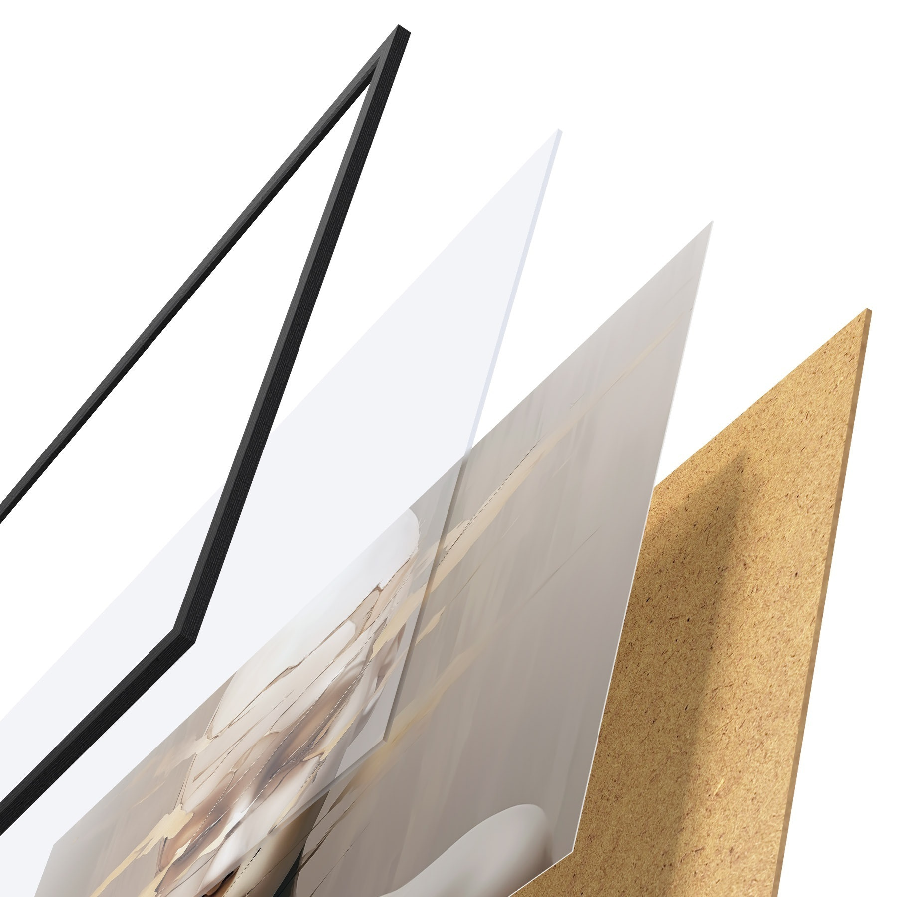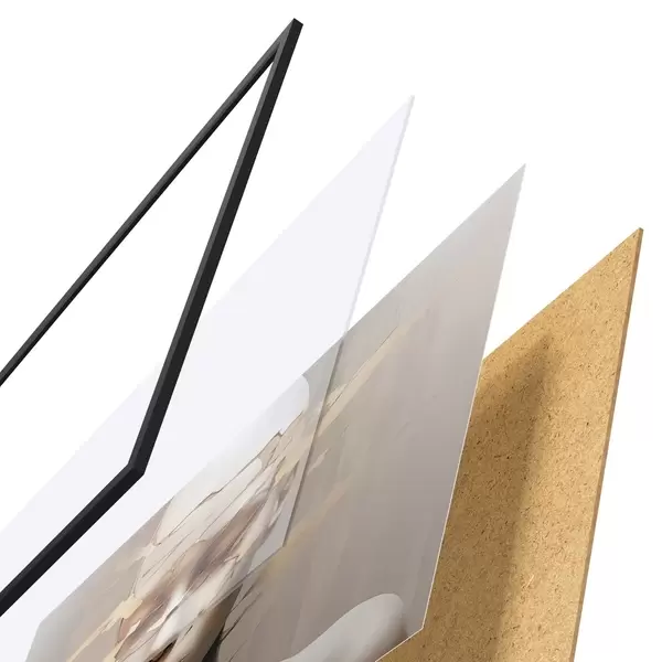 Das Poster besteht aus einem Rahmen, Plexiglas, einem gedruckten Bild und einer Rückwand aus Spanplatten. Dank der Halterungen auf der Rückseite kann das Poster sofort an die Wand gehängt werden.