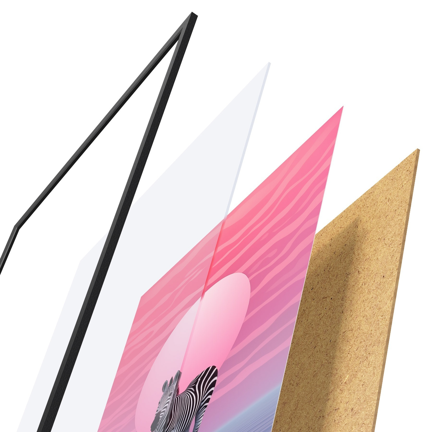 Das Poster besteht aus einem Rahmen, Plexiglas, einem gedruckten Bild und einer Rückwand aus Spanplatten. Dank der Halterungen auf der Rückseite kann das Poster sofort an die Wand gehängt werden.