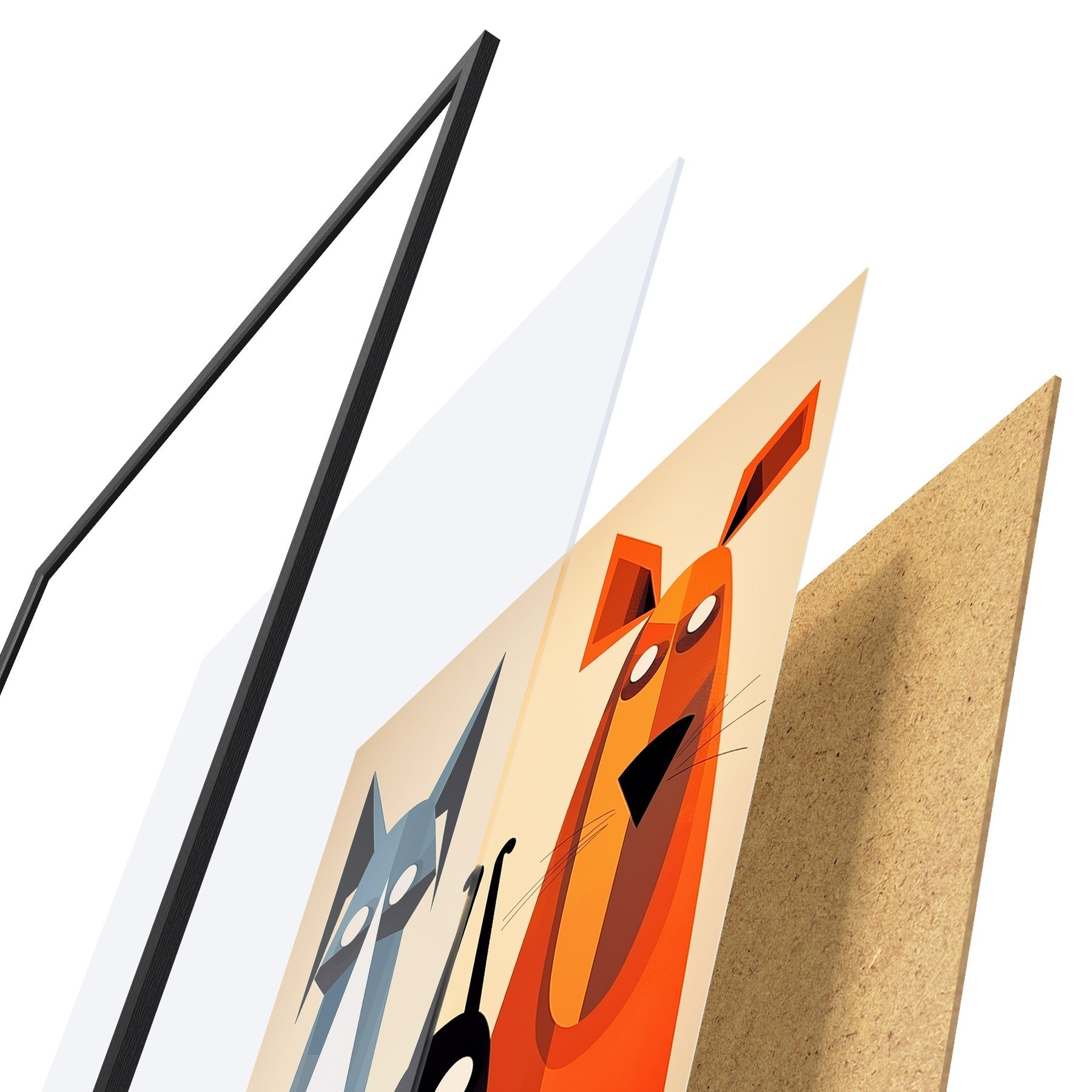Das Poster besteht aus einem Rahmen, Plexiglas, einem gedruckten Bild und einer Rückwand aus Spanplatten. Dank der Halterungen auf der Rückseite kann das Poster sofort an die Wand gehängt werden.