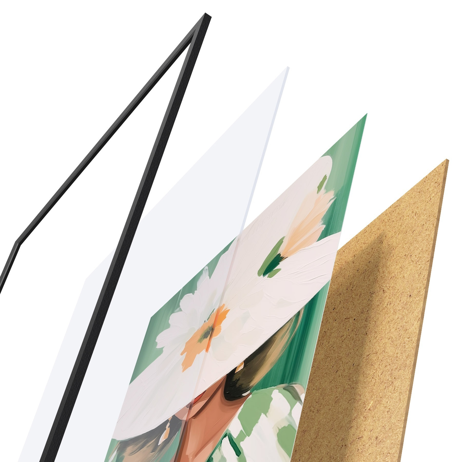Das Poster besteht aus einem Rahmen, Plexiglas, einem gedruckten Bild und einer Rückwand aus Spanplatten. Dank der Halterungen auf der Rückseite kann das Poster sofort an die Wand gehängt werden.