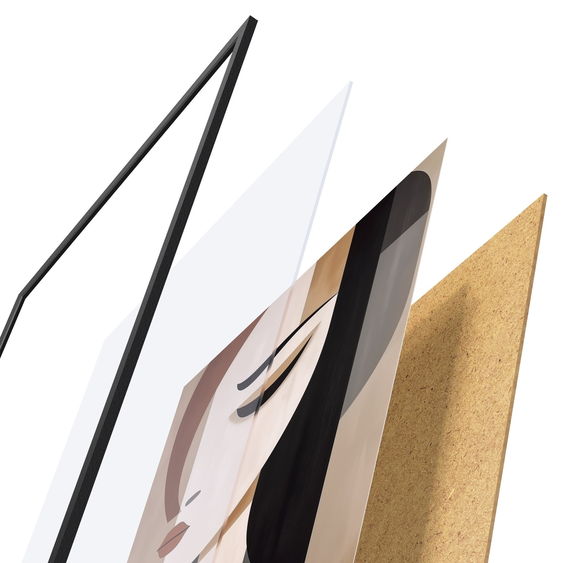 Das Poster besteht aus einem Rahmen, Plexiglas, einem gedruckten Bild und einer Rückwand aus Spanplatten. Dank der Halterungen auf der Rückseite kann das Poster sofort an die Wand gehängt werden.