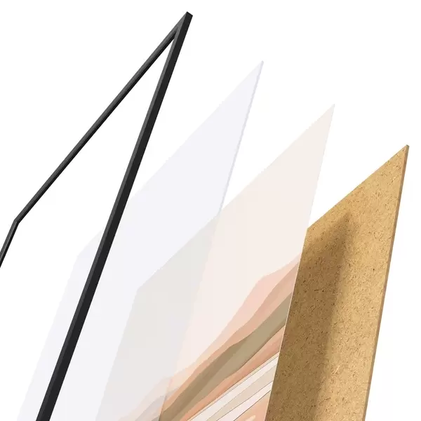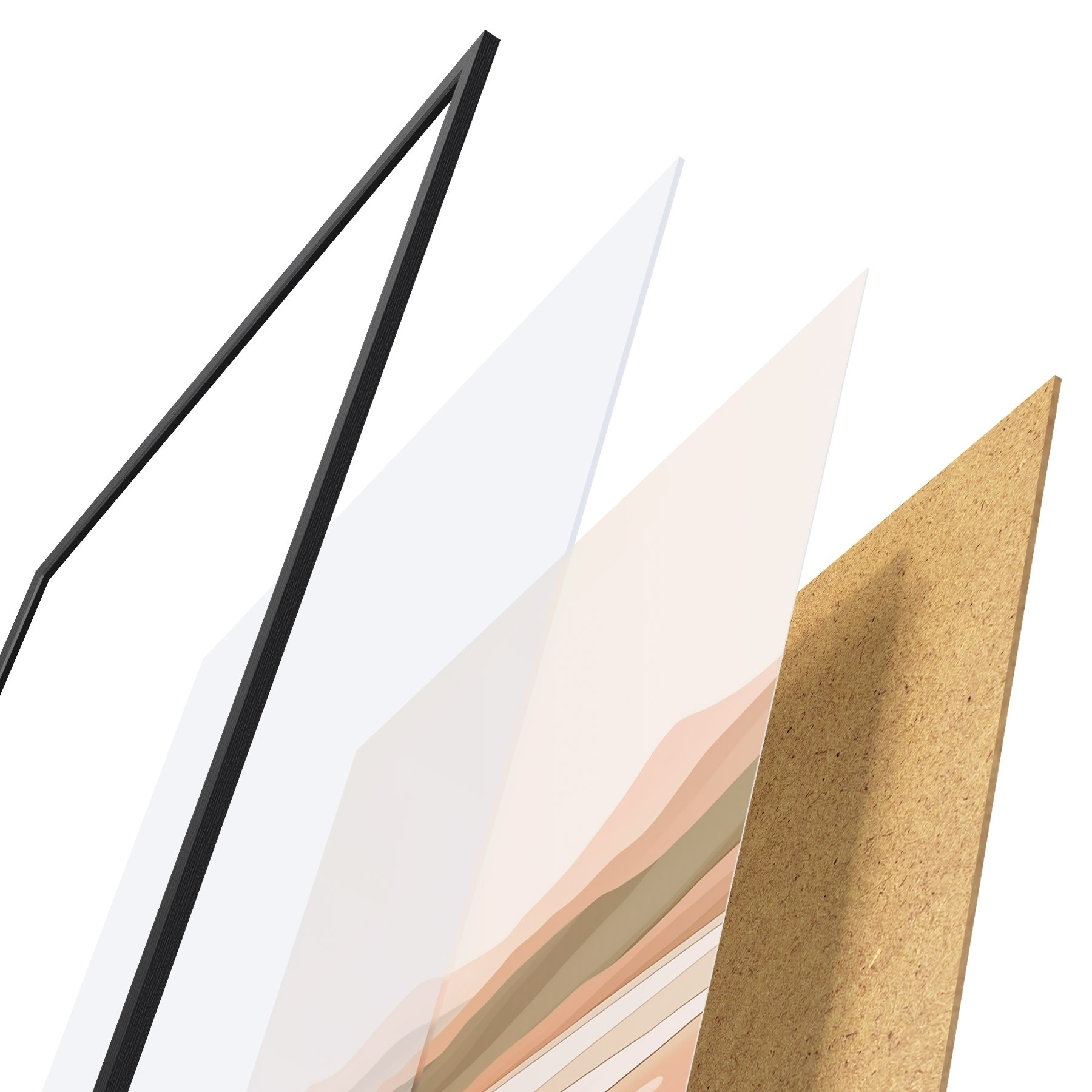 Das Poster besteht aus einem Rahmen, Plexiglas, einem gedruckten Bild und einer Rückwand aus Spanplatten. Dank der Halterungen auf der Rückseite kann das Poster sofort an die Wand gehängt werden.