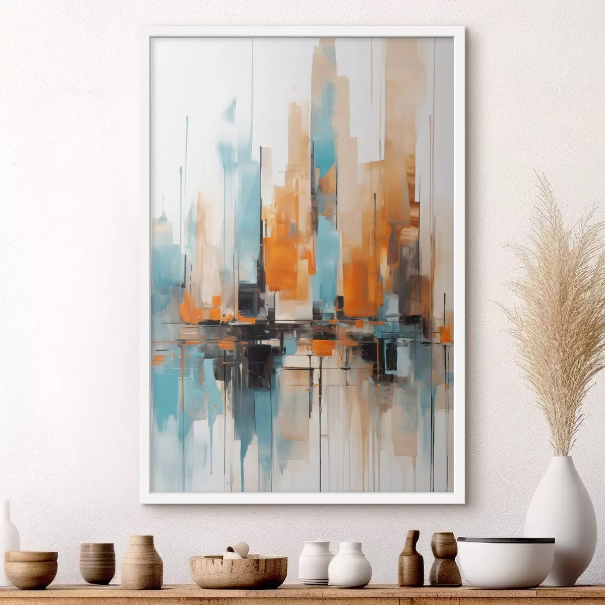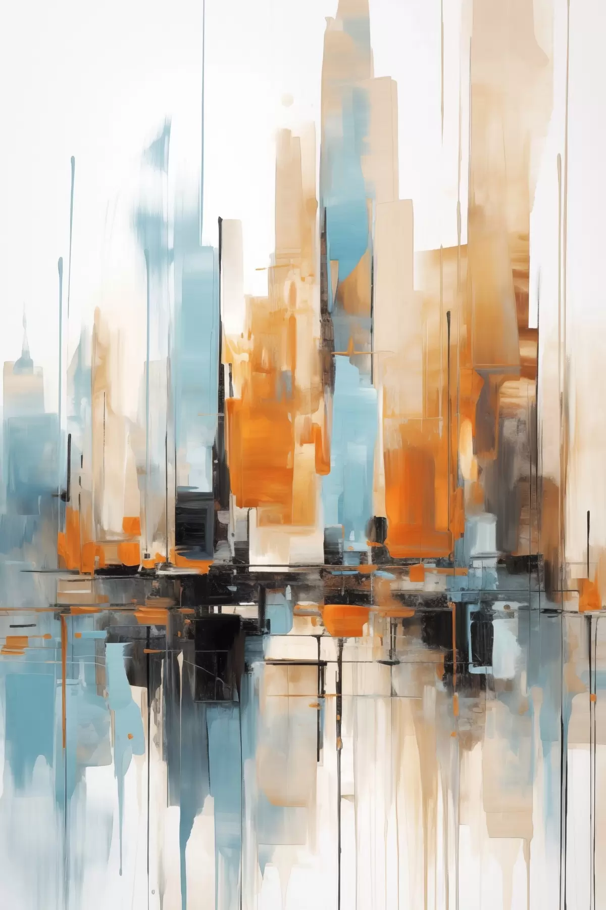 Poster Abstrakte Stadtlandschaft mit vertikalen Pinselstrichen in Orange-, Blau- und Weißtönen, Malstil f46267