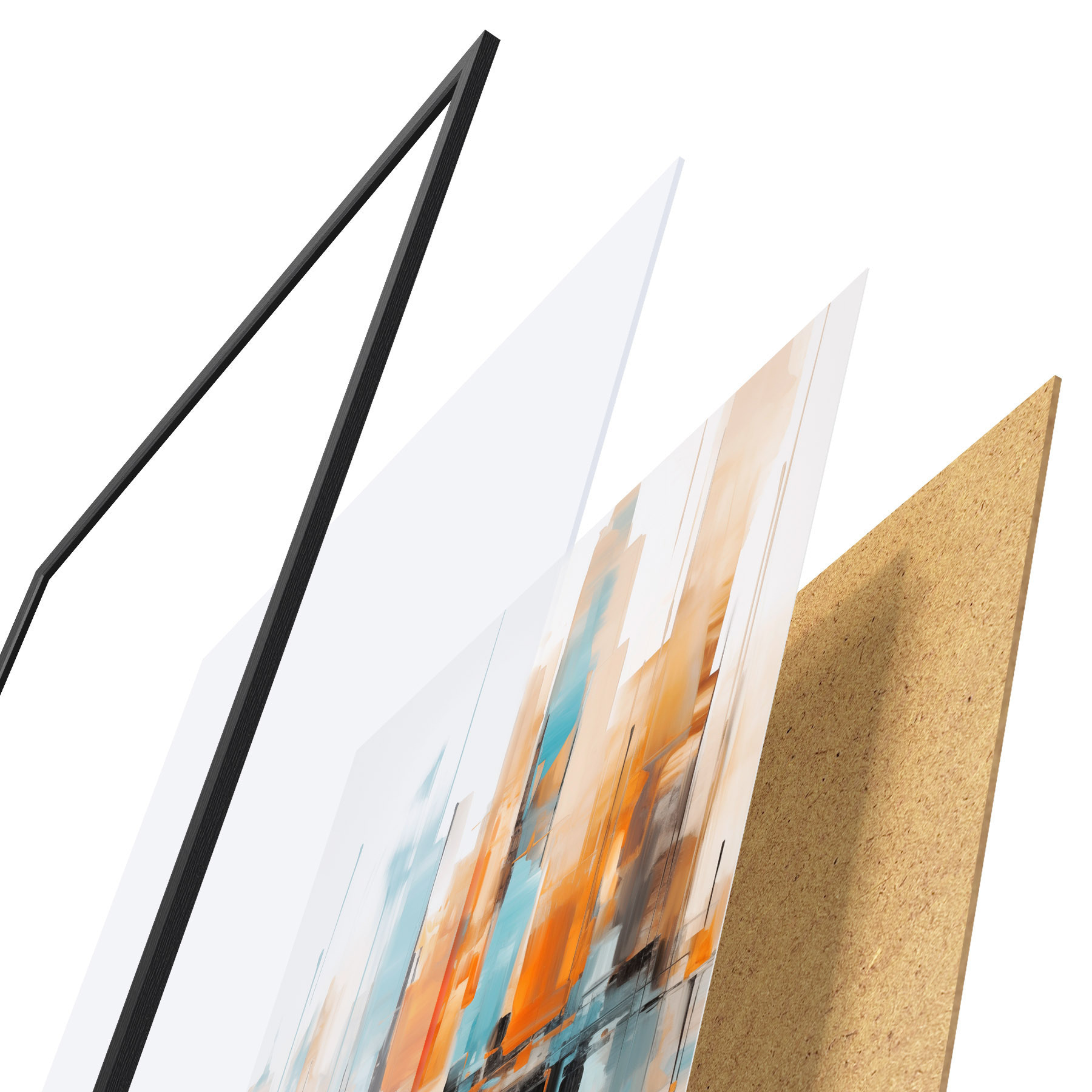 Das Poster besteht aus einem Rahmen, Plexiglas, einem gedruckten Bild und einer Rückwand aus Spanplatten. Dank der Halterungen auf der Rückseite kann das Poster sofort an die Wand gehängt werden.
