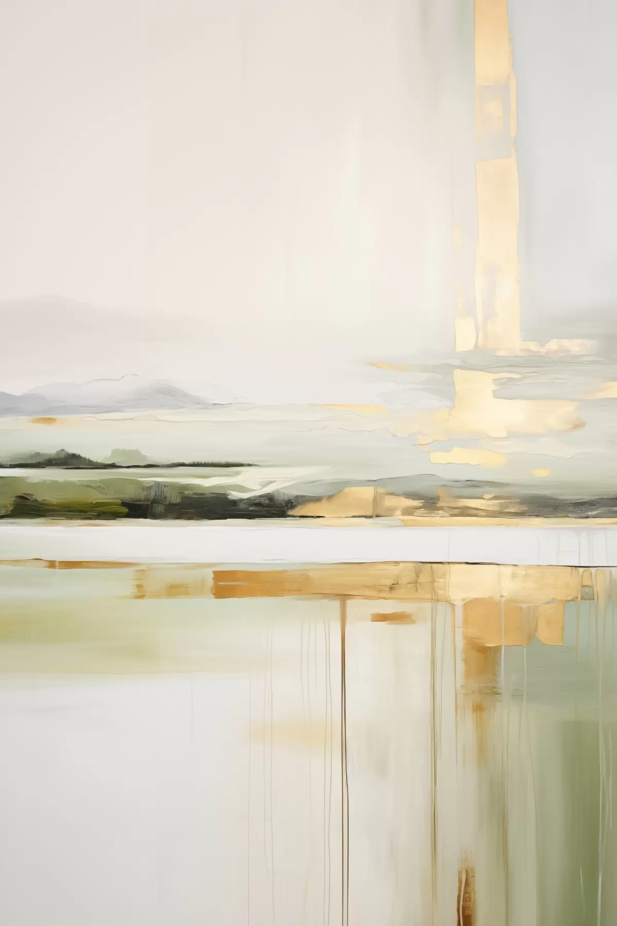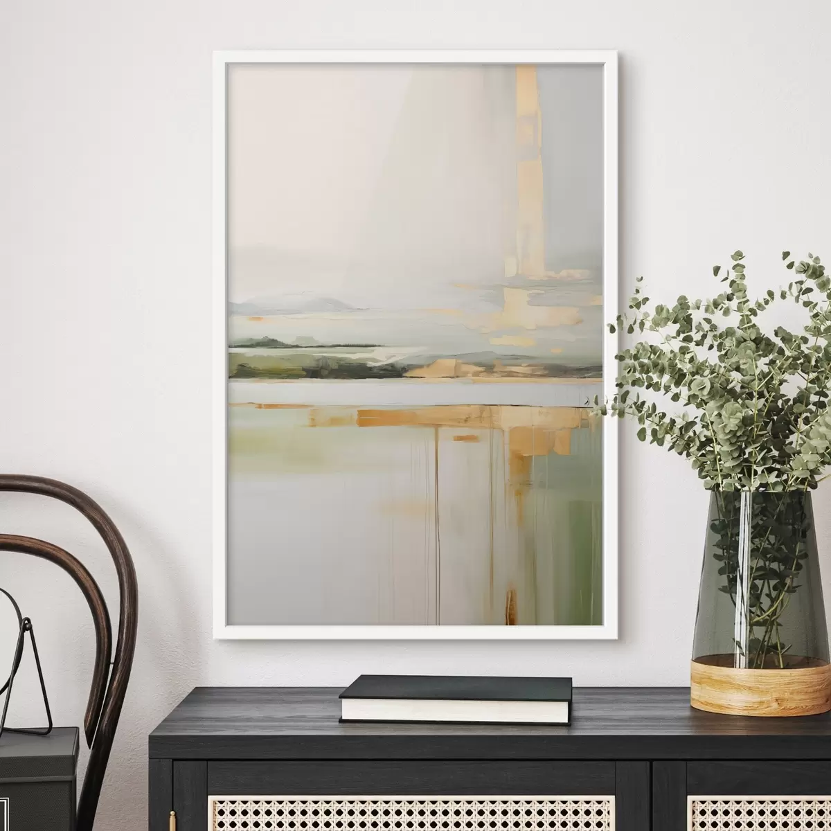 Poster Abstrakte Landschaft mit gelben Akzenten, eine minimalistische Komposition aus Land, Wasser und Himmel, mit gedämpften Farben Nr f46268