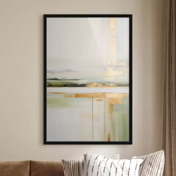 Poster Abstrakte Landschaft mit gelben Akzenten, eine minimalistische Komposition aus Land, Wasser und Himmel, mit gedämpften Farben f46268