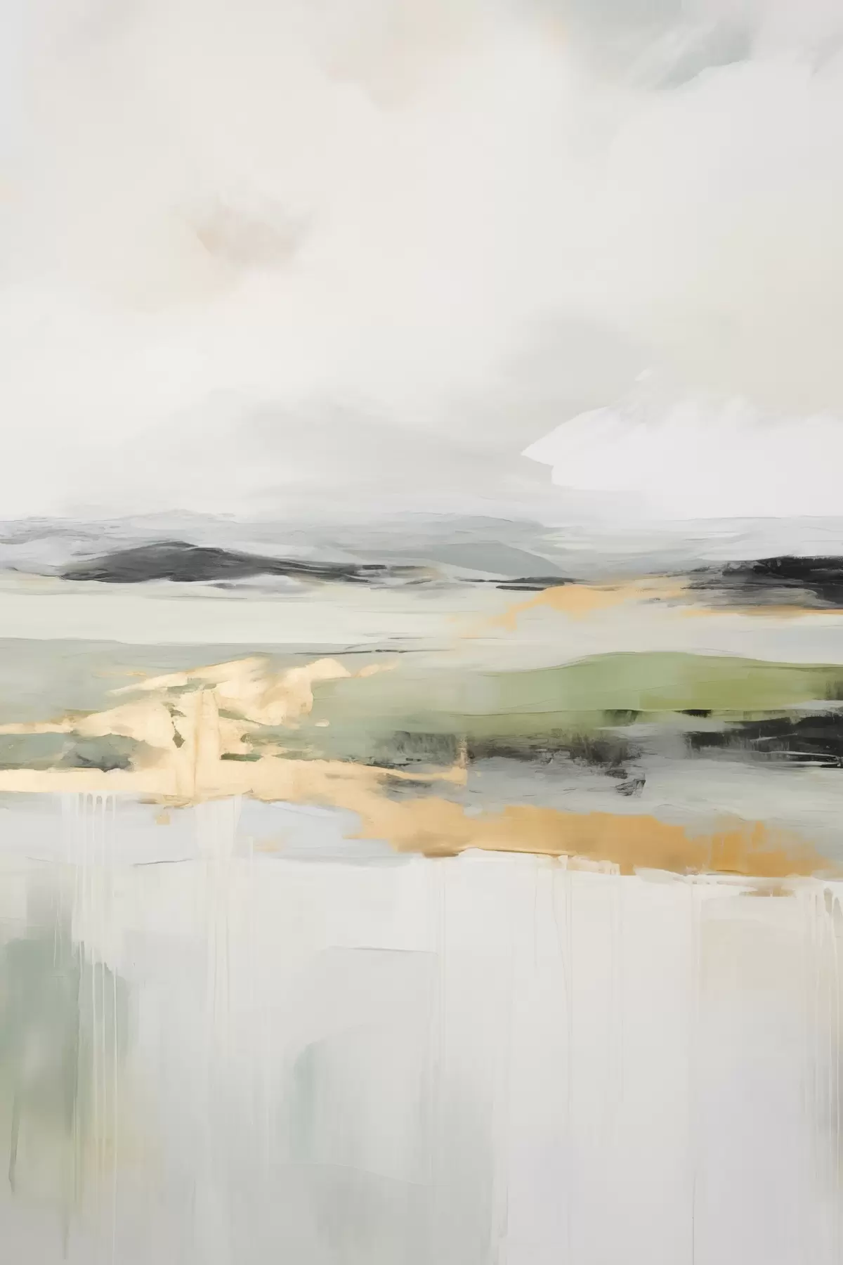 Poster Abstrakte Landschaft mit gelben Akzenten, eine minimalistische Komposition aus Land, Wasser und Himmel, mit gedämpften Farben Nr f46269