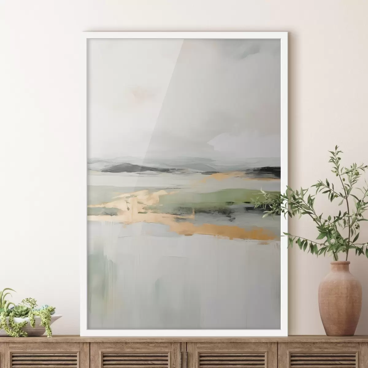 Poster Abstrakte Landschaft mit gelben Akzenten, eine minimalistische Komposition aus Land, Wasser und Himmel, mit gedämpften Farben f46269