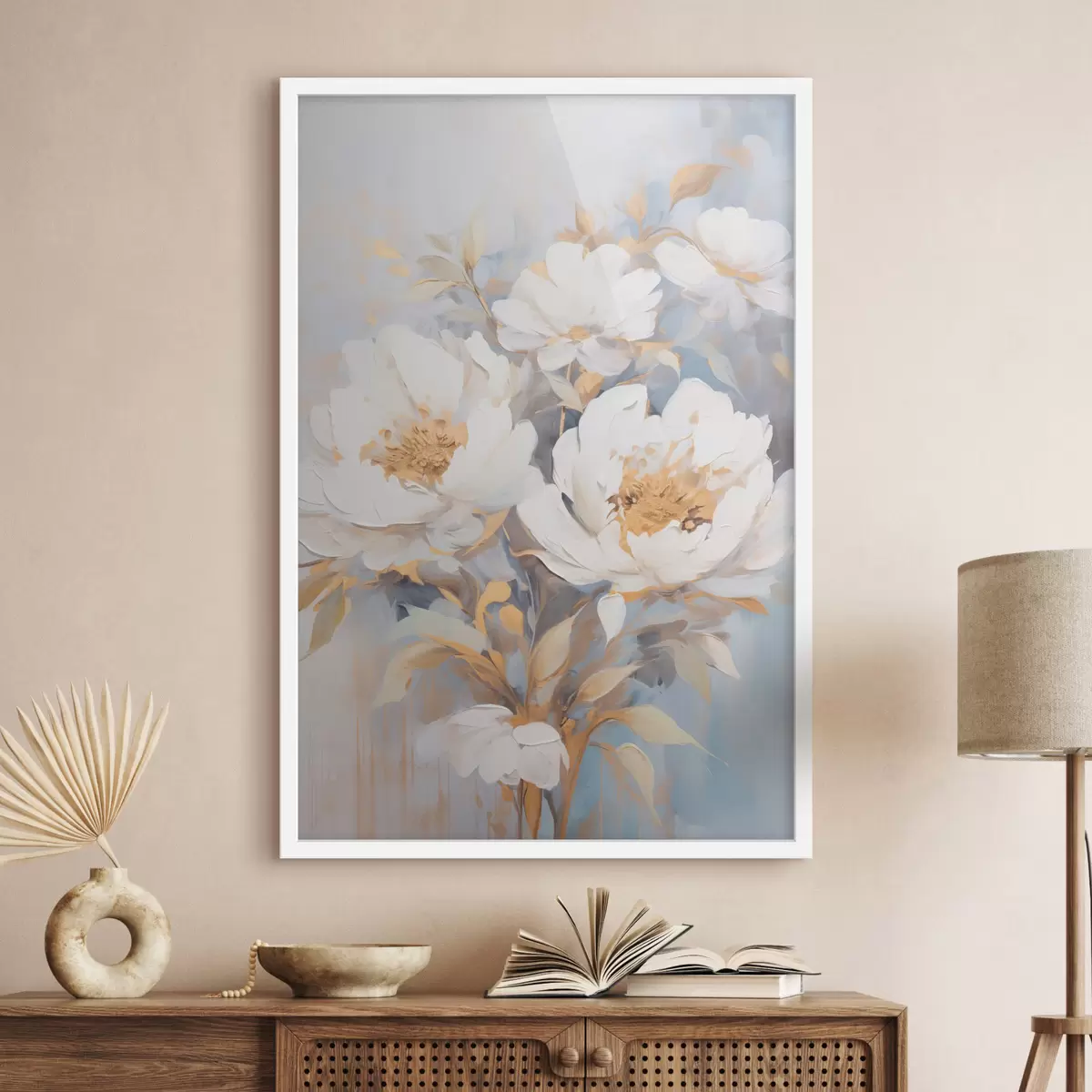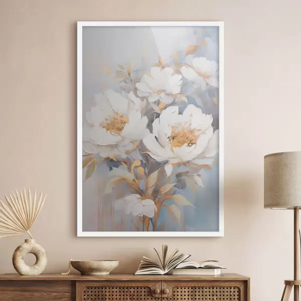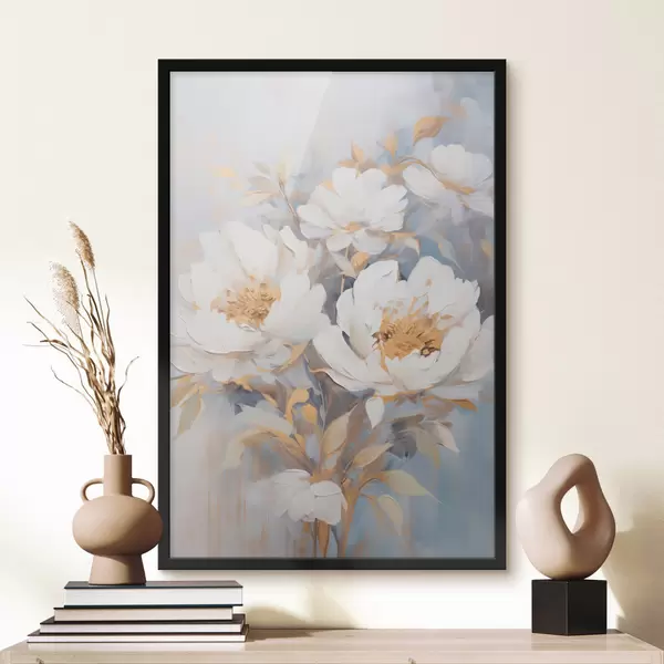 Poster Weiße Pfingstrosen mit blauen Blütenkernen und Blättern, sanfte Pinselstriche, hellblauer Hintergrund, Blumenarrangement Nr f46270
