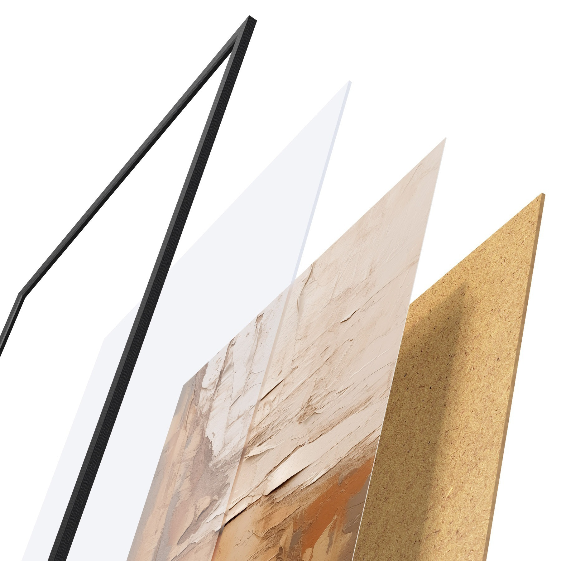 Das Poster besteht aus einem Rahmen, Plexiglas, einem gedruckten Bild und einer Rückwand aus Spanplatten. Dank der Halterungen auf der Rückseite kann das Poster sofort an die Wand gehängt werden.