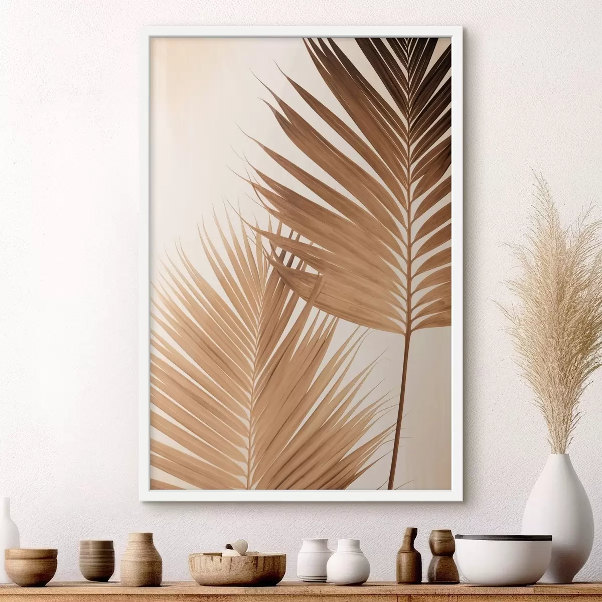 Poster Palmenblätter in Brauntönen, neutraler Hintergrund, minimalistischer Stil, natürliche Beleuchtung, tropisches Flair Nr f46274