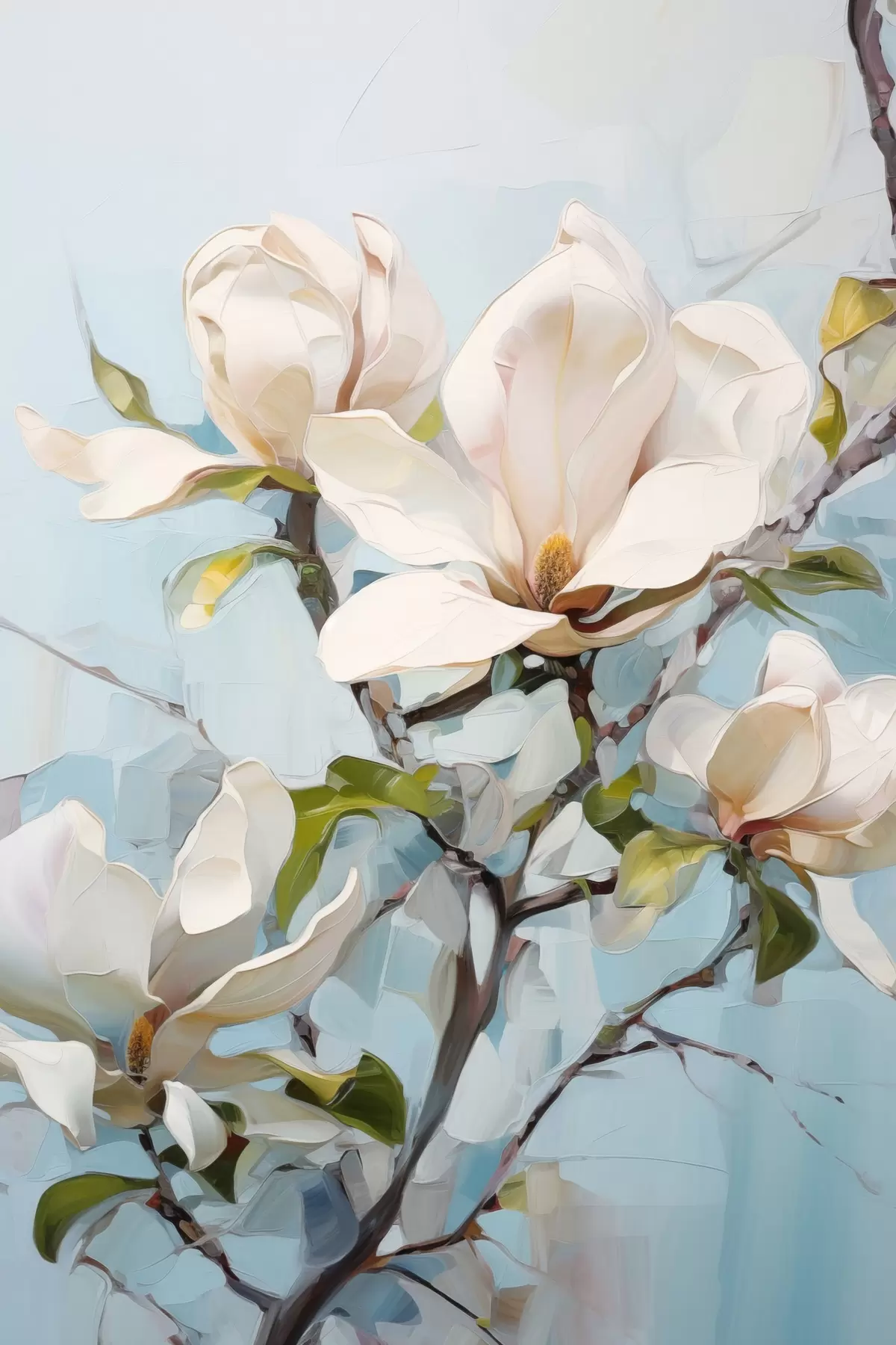 Poster Weiße Magnolienblüten, hellblauer Hintergrund mit sanften Pinselstrichen, Ölgemälde-Stil, pastose Textur Nr f46277