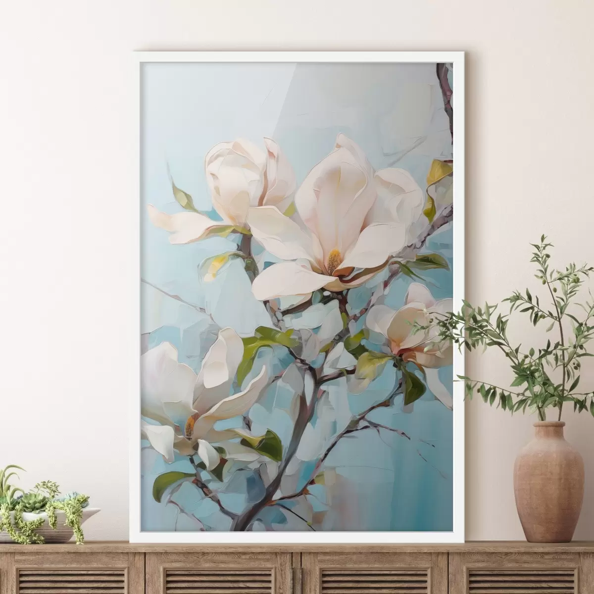 Poster Weiße Magnolienblüten, hellblauer Hintergrund mit sanften Pinselstrichen, Ölgemälde-Stil, pastose Textur f46277