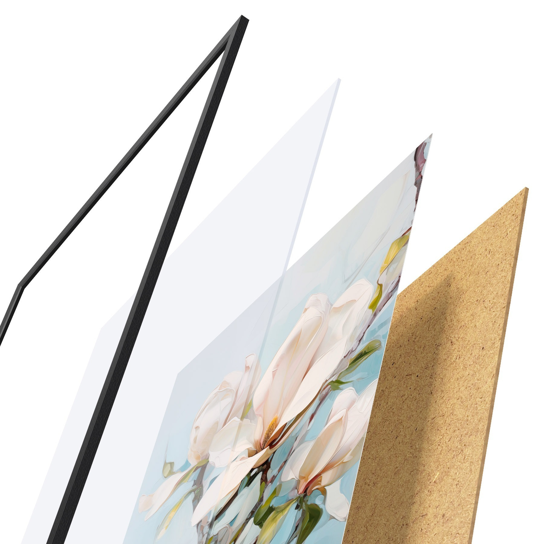 Das Poster besteht aus einem Rahmen, Plexiglas, einem gedruckten Bild und einer Rückwand aus Spanplatten. Dank der Halterungen auf der Rückseite kann das Poster sofort an die Wand gehängt werden.