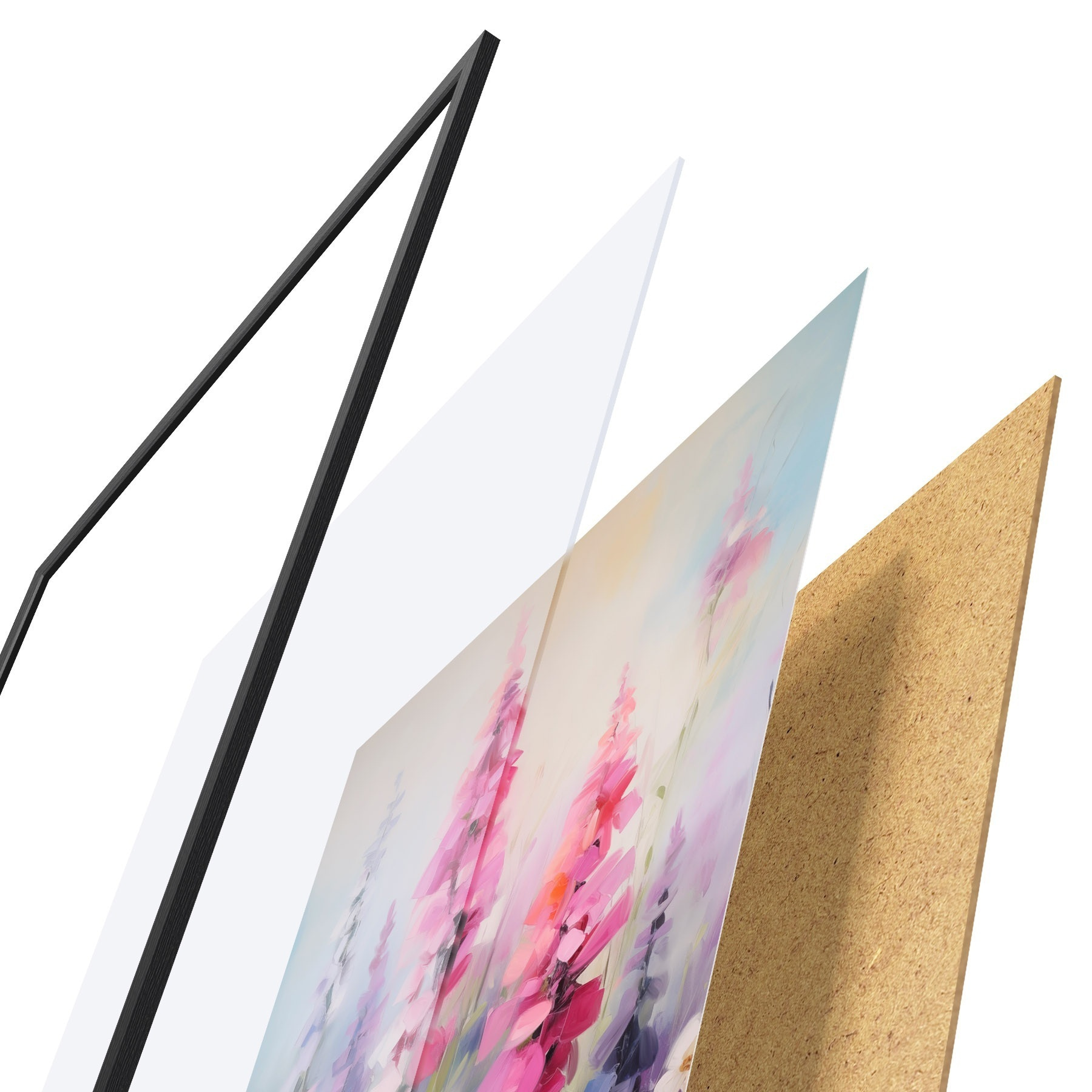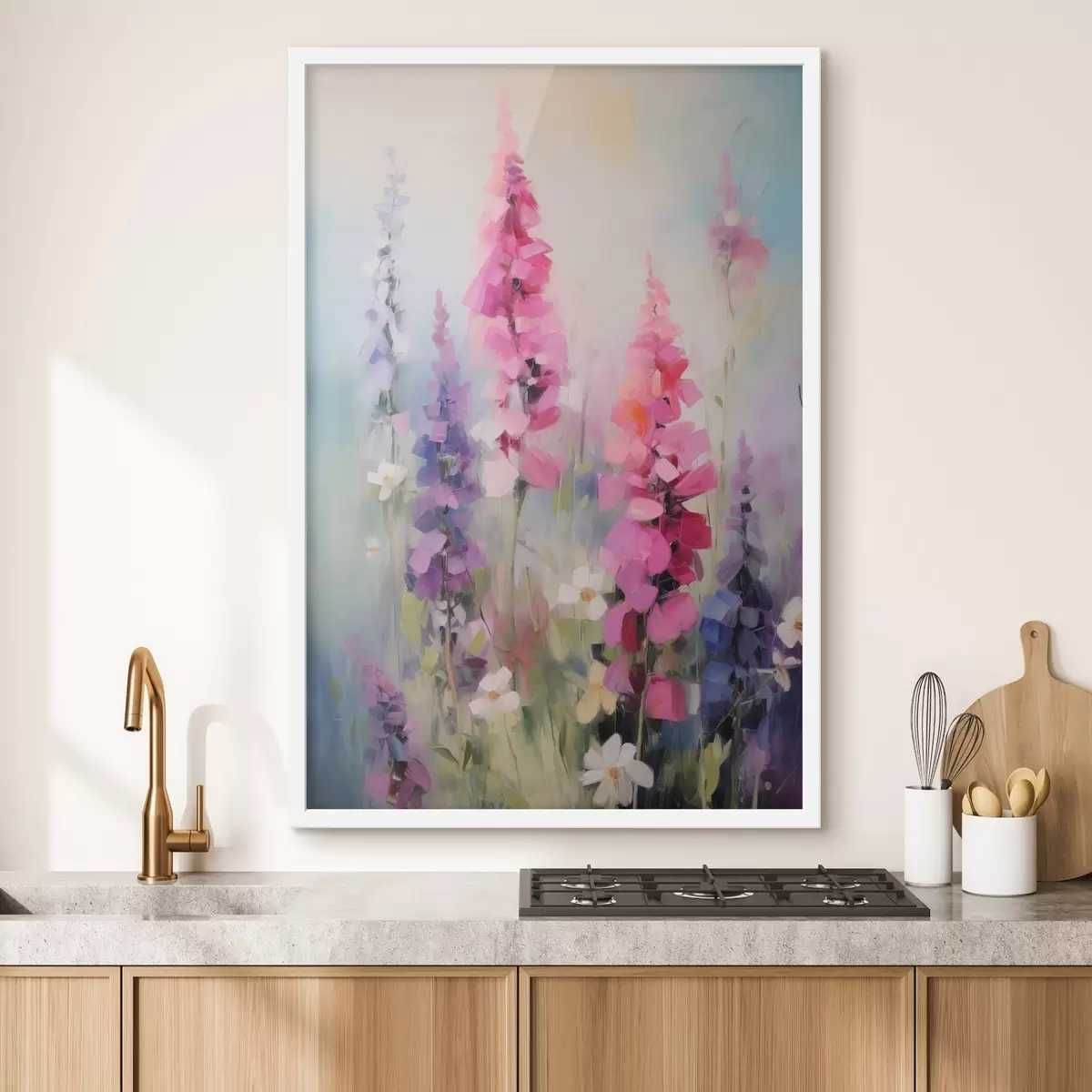 Poster Rosa und violette Blumen mit weißen Gänseblümchen auf einer Wiese, sanfte Pinselstriche, Pastellfarben, impressionistischer Stil Nr f46279