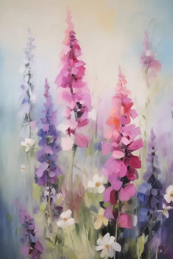 Poster Rosa und violette Blumen mit weißen Gänseblümchen auf einer Wiese, sanfte Pinselstriche, Pastellfarben, impressionistischer Stil f46279