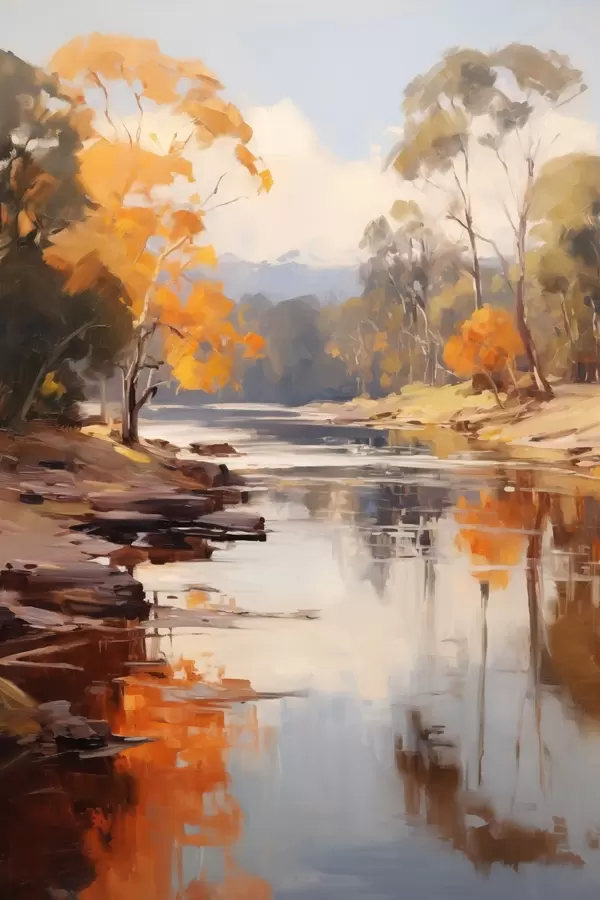 Poster Herbstlandschaft, Fluss mit Bäumen am Ufer, Wald im Hintergrund, Spiegelungen auf dem Wasser Nr f46280