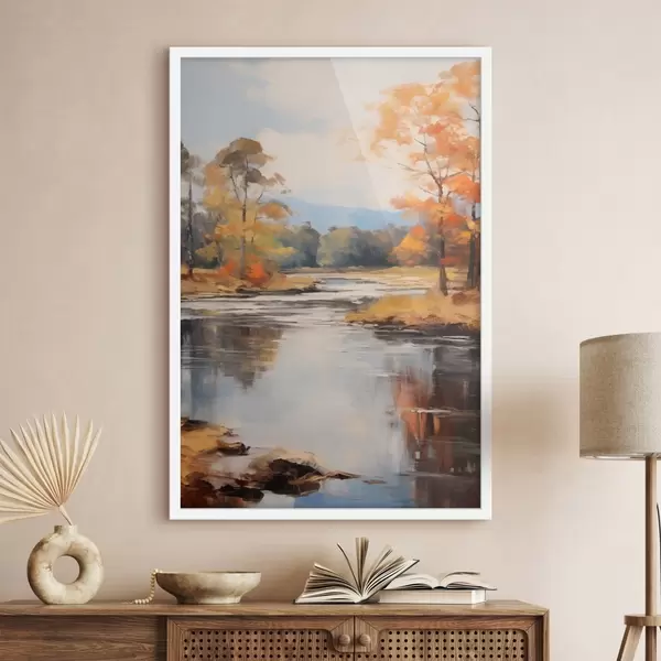 Poster Landschaft mit einem Fluss, der durch einen Wald im Herbst fließt, gelbe und orangefarbene Bäume, Malstil Nr f46281