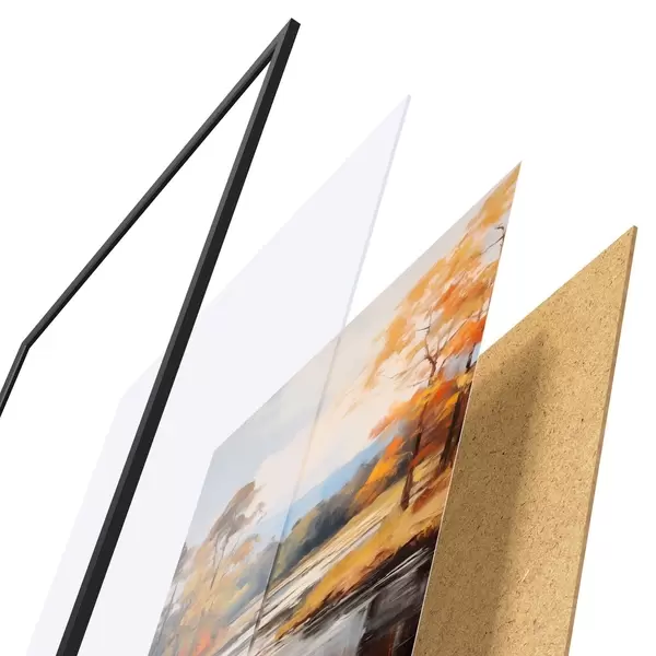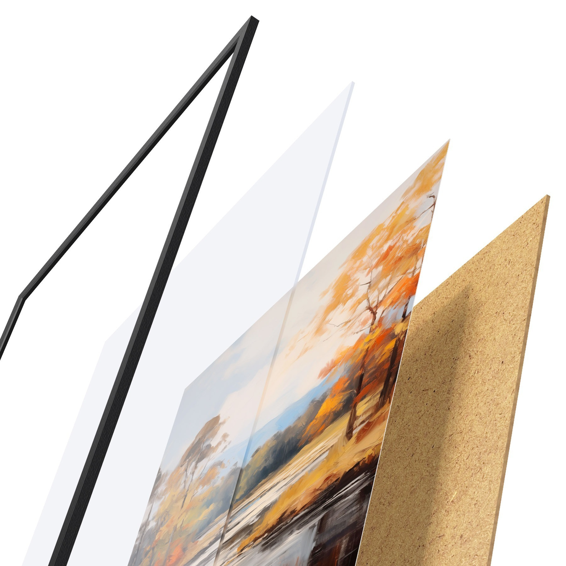 Das Poster besteht aus einem Rahmen, Plexiglas, einem gedruckten Bild und einer Rückwand aus Spanplatten. Dank der Halterungen auf der Rückseite kann das Poster sofort an die Wand gehängt werden.