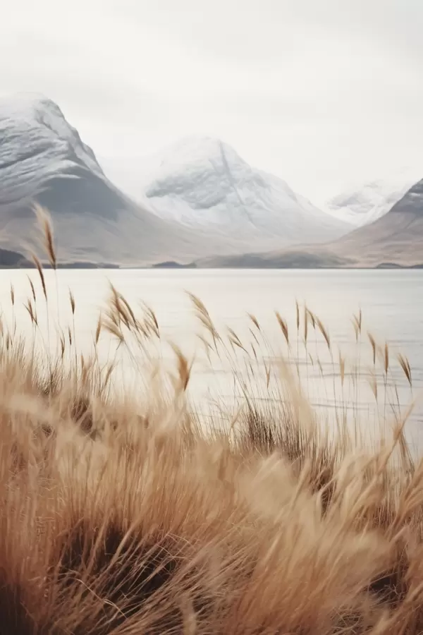 Poster Pampasgrasfeld vor einer Seenlandschaft mit schneebedeckten Bergen im Hintergrund, weiches Licht Nr f46282