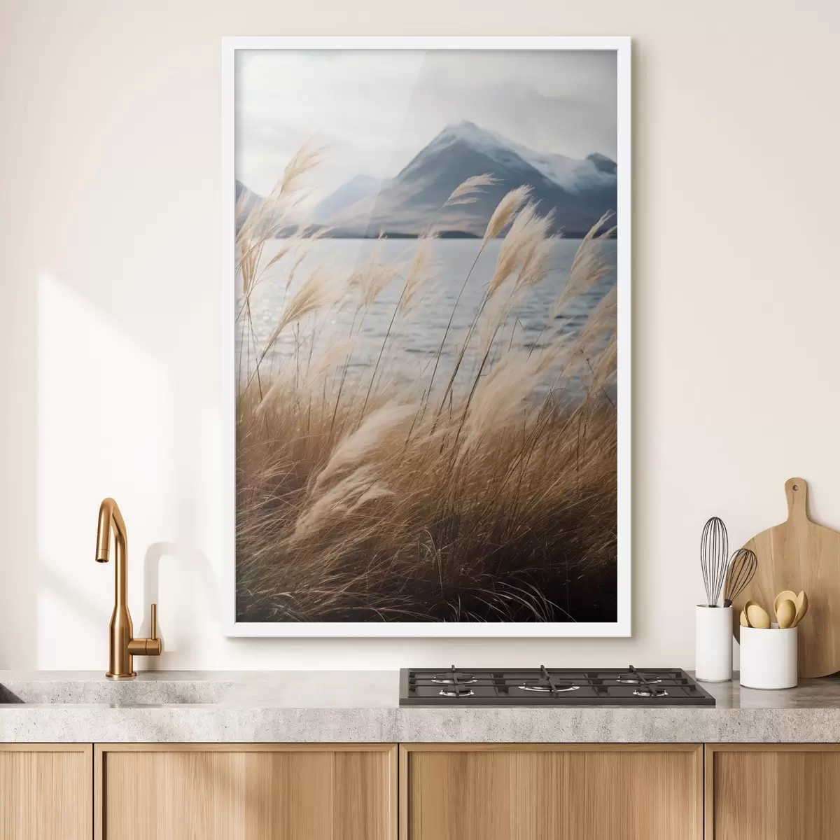 Poster Pampasgras mit einem See und Bergen im Hintergrund, sanfte Beleuchtung, gedämpfte Farben, naturalistischer Stil f46283
