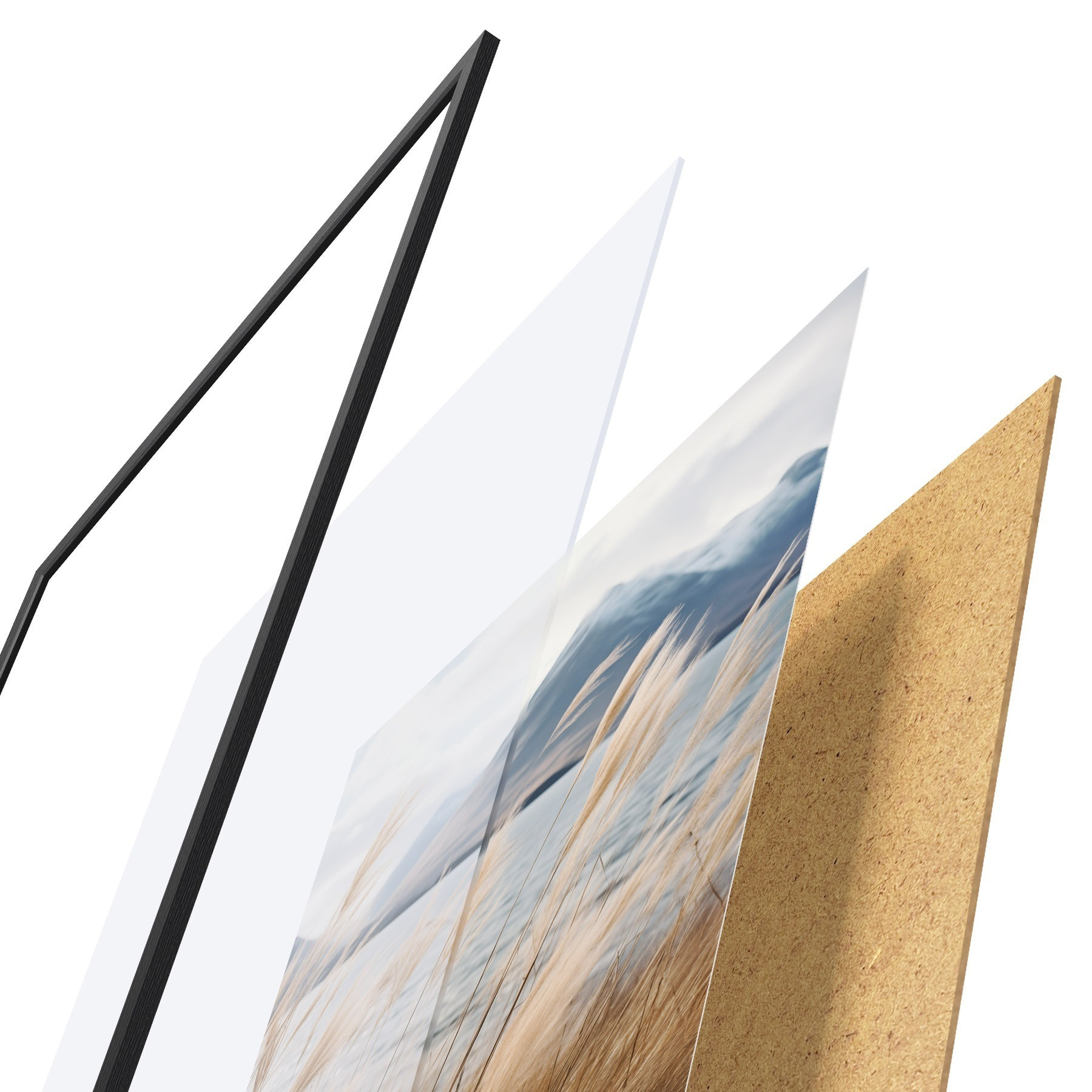 Das Poster besteht aus einem Rahmen, Plexiglas, einem gedruckten Bild und einer Rückwand aus Spanplatten. Dank der Halterungen auf der Rückseite kann das Poster sofort an die Wand gehängt werden.