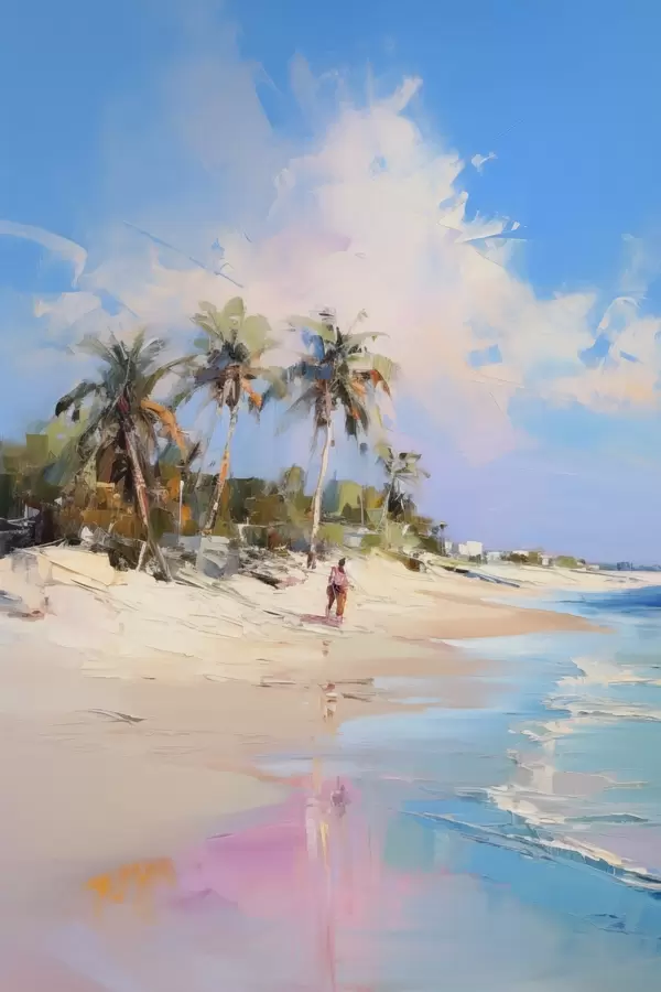 Poster Abstrakte Landschaft, ein Strand mit Palmen, strahlender Sonnenschein mit blauem Himmel und einigen Wolken f46284