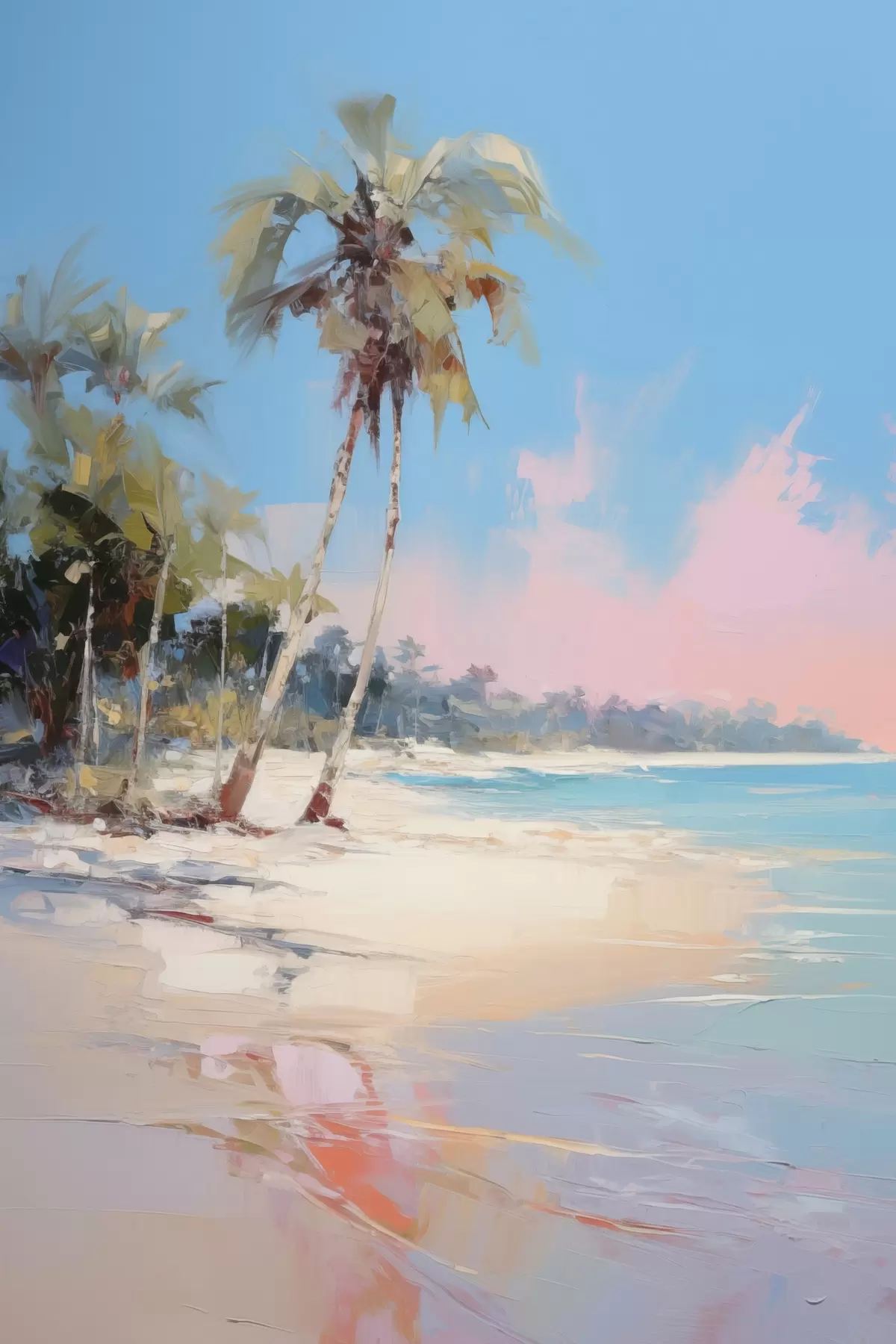 Poster Abstrakter tropischer Strand mit weißem Sand und Palmen, blauer Himmel mit weißen Wolken Nr f46285