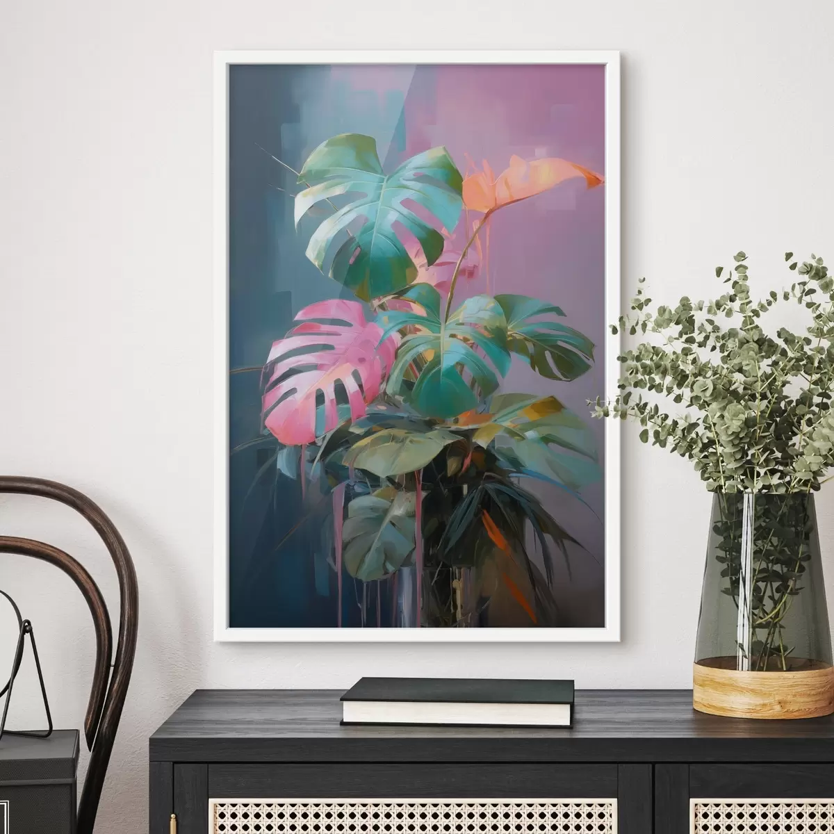 Poster Abstrakte Monstera-Pflanze mit rosa und grünen Blättern, leuchtenden Farben, vor einem unscharfen Hintergrund Nr f46287