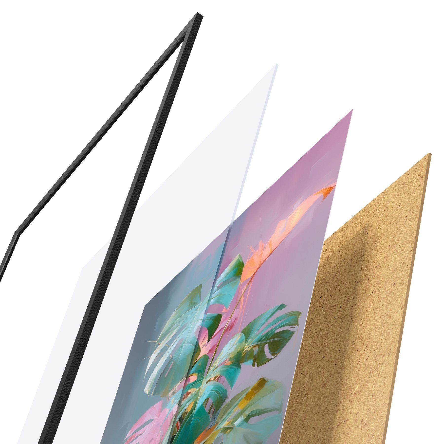 Das Poster besteht aus einem Rahmen, Plexiglas, einem gedruckten Bild und einer Rückwand aus Spanplatten. Dank der Halterungen auf der Rückseite kann das Poster sofort an die Wand gehängt werden.
