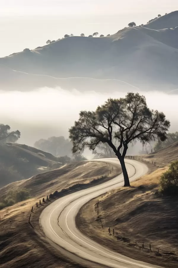 Poster Eine kurvenreiche Straße durch sanfte Hügel mit einem Baum im Vordergrund, im Hintergrund Nebel und Berge Nr f46288