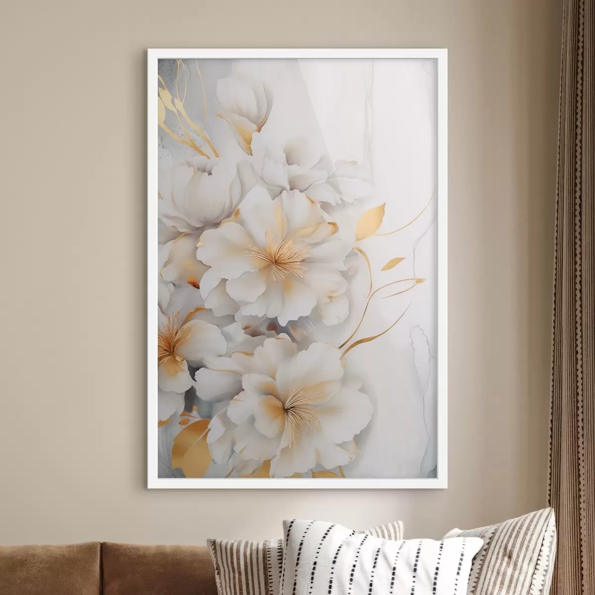 Poster Weiße Blüten mit gelben Details, Blütenblätter mit dezenten Schatten, heller Hintergrund mit dezentem Marmoreffekt Nr f46292