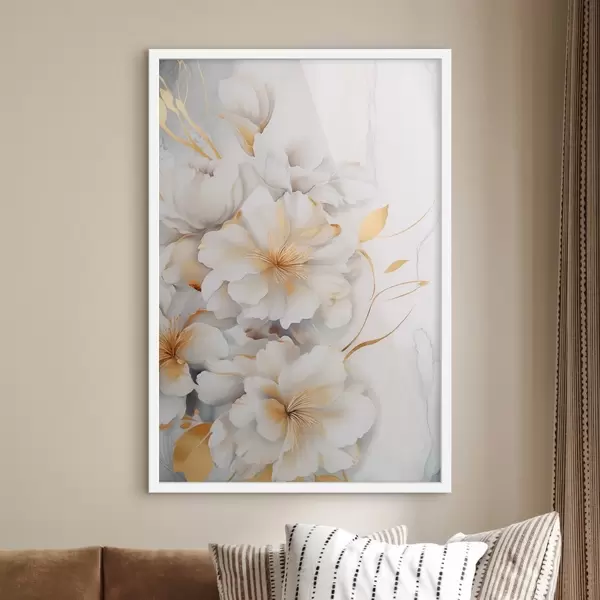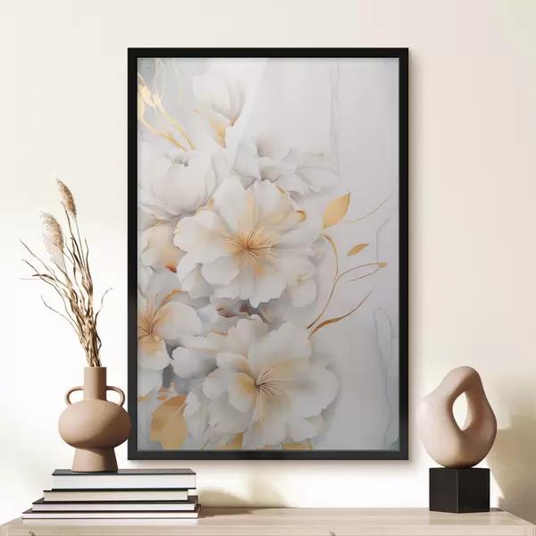 Poster Weiße Blüten mit gelben Details, Blütenblätter mit dezenten Schatten, heller Hintergrund mit dezentem Marmoreffekt f46292