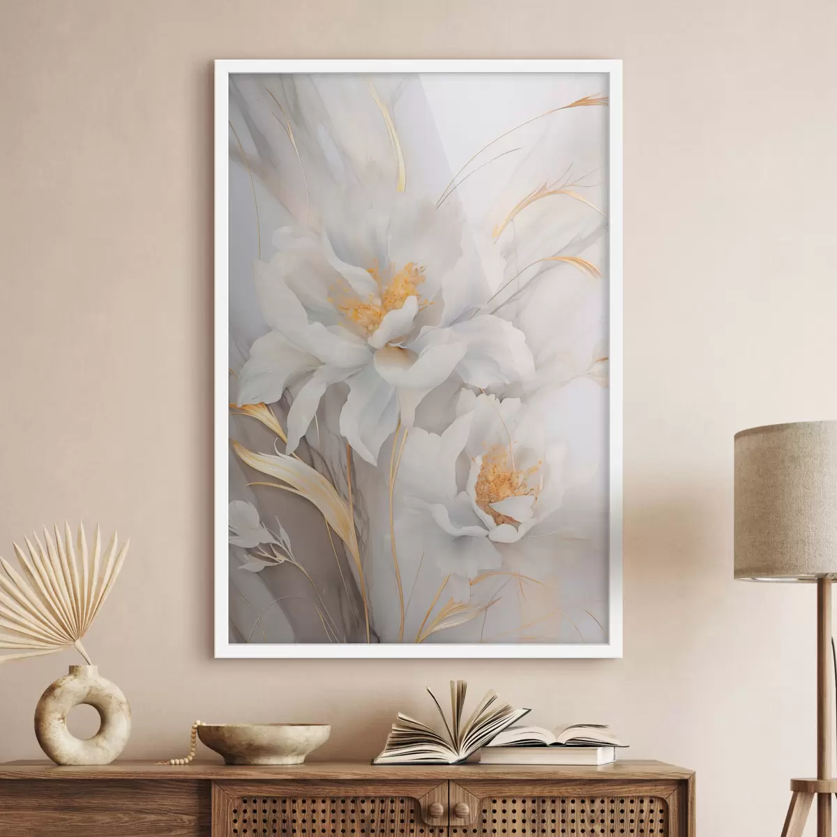 Poster Weiße Blüten mit gelben Stempeln und Stielen, zarte Blütenblätter, elegante Komposition, neutraler Hintergrund Nr f46293